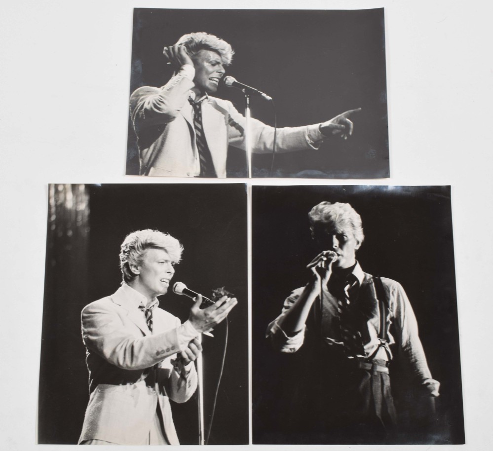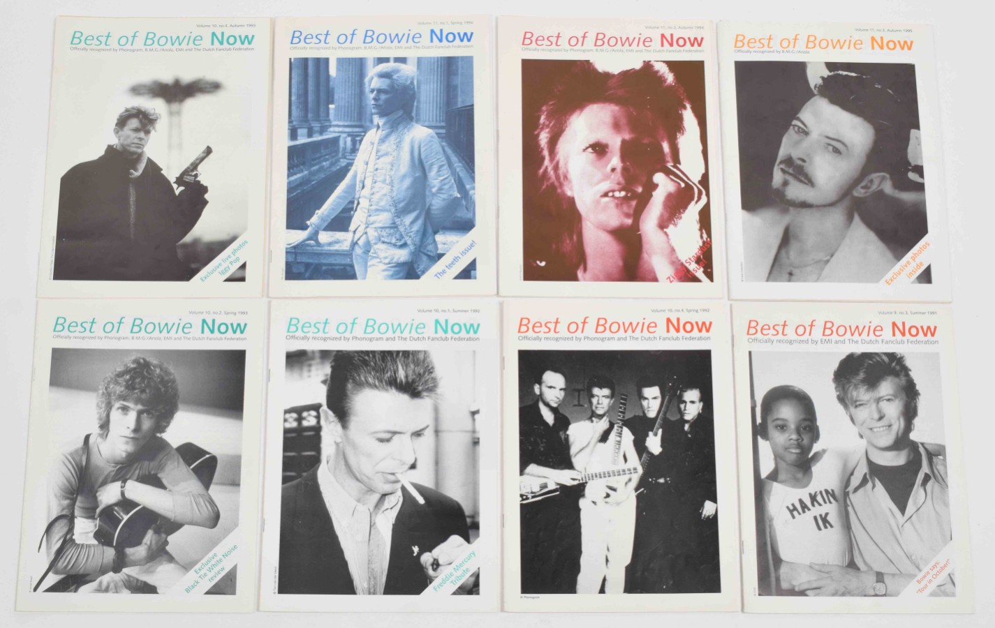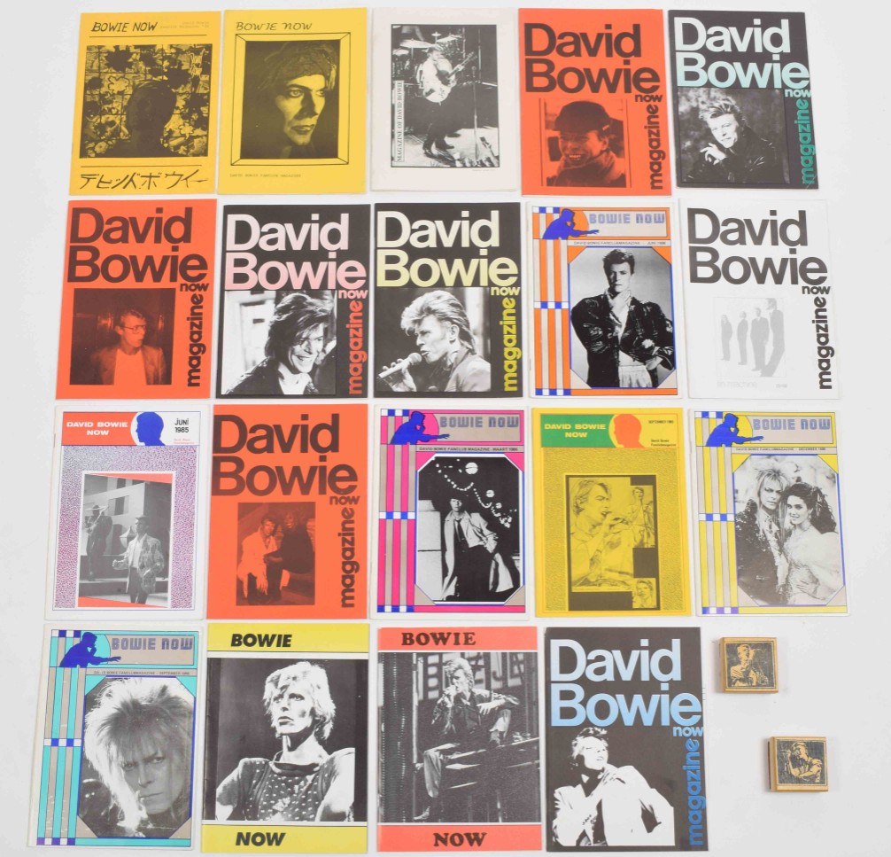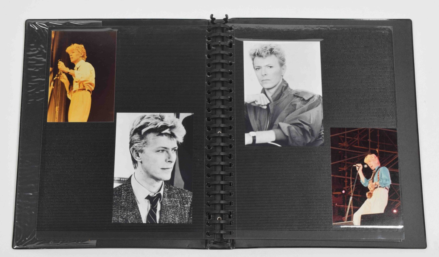 Ring binder with mounted newspaper and magazine clippings, picture postcards, several (folding) posters and 4 concert tickets. The tickets for the Serious Moonlight Tour, the Glass Spider Tour and the A Reality Tour + folder with 18 inserted pictures, some original colour pictures + fanzine David Bowie Now [later: The Voyeur], 28 issues. 1984-1998 + programmes for the Serious Moonlight Tour '83 and the Glass Spider Tour - and 28 more, incl. picture reproductions, a poster and books.