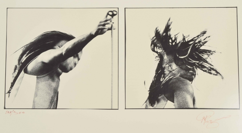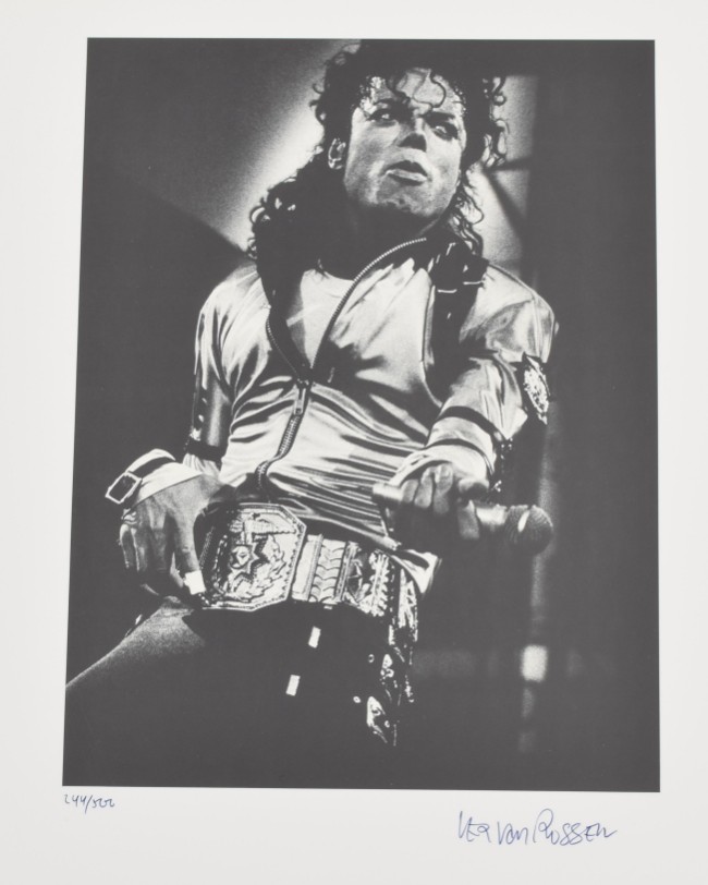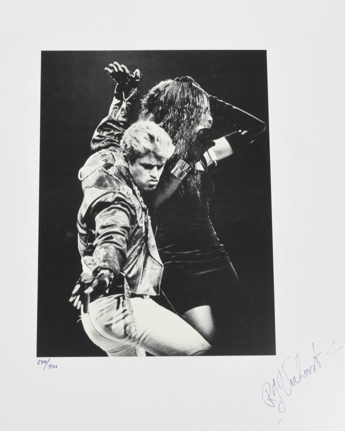 With 6 signed and numbered prints: (1) Richenel. Peter Gramberg (1957). 40 x 40 cm; (2) Living Colour. Rico d'Rozario (1944). 2 photographs of 23 x 25.5 cm; (3) Cyndi Lauper. Govert de Roos (1953). 35.5 x 35 cm; (4) George Michael. Rob Verhorst (1952). 37 x 27 cm; (5) Herman Brood. Gerard Wessel (1960). 40.5 x 40.5 cm; (6) Michael Jackson. Lex van Rossen (1950). 39 x 30 cm. All plates 60 x 50 cm, handnumbered 244/500. Description of the photographer's career on verso.