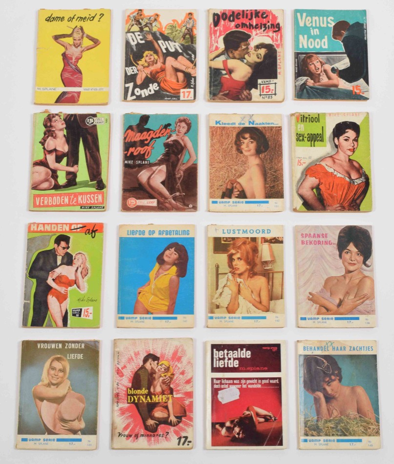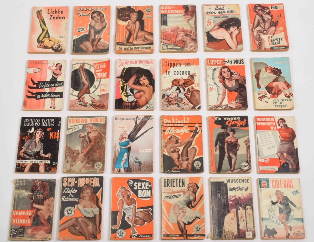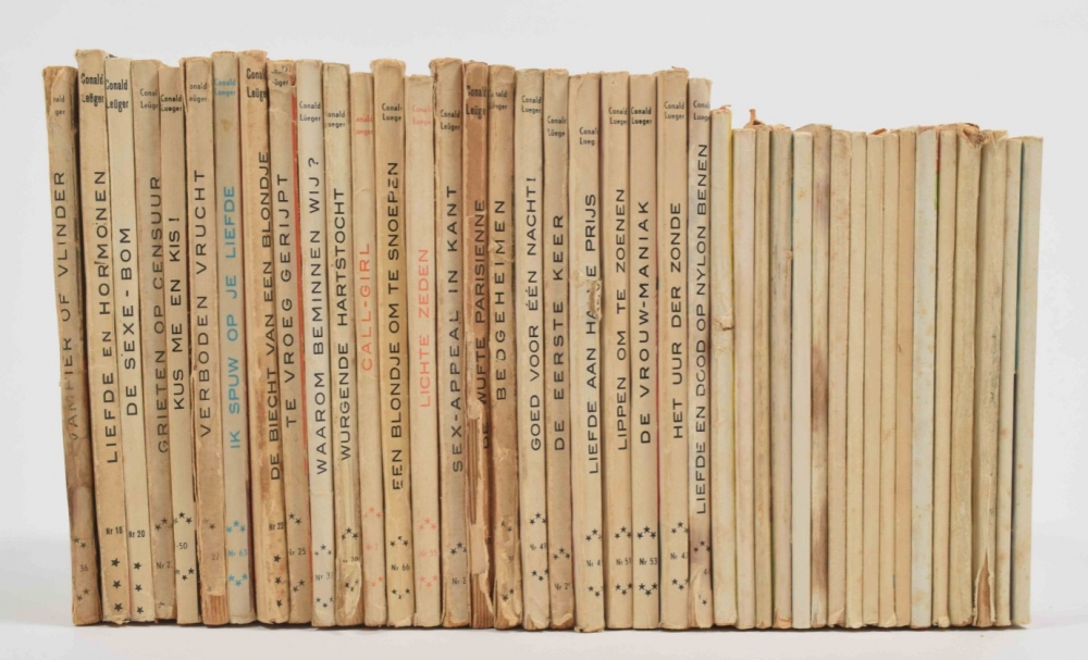 Lot with 41 erotic pulp paperbacks: Een blondje om te snoepen. Conald Lueger. Faun Collection, No. 66. Deurne/Antwerp, O. Huybrichs, c. 1955 + 23 more from the Faun Collection, each by Conald Luëger, c. 1955-1965 + Gij zult niet zoenen. Vamp no. 76. M. Splane. Idem, c. 1955 - and 16 other volumes from the Vamp series, c. 1955-1965.