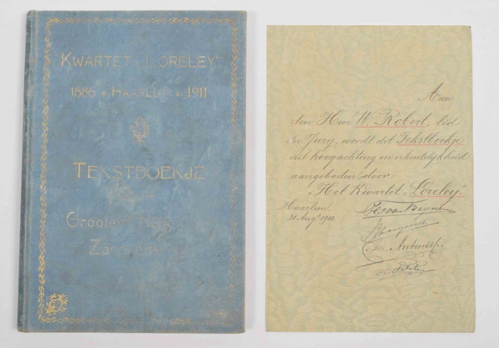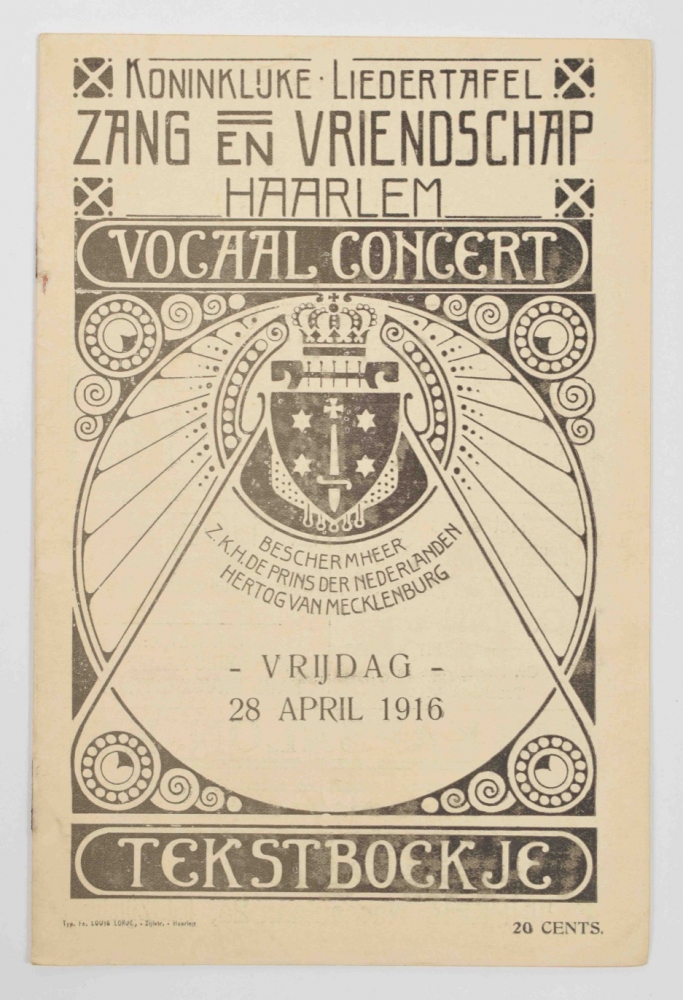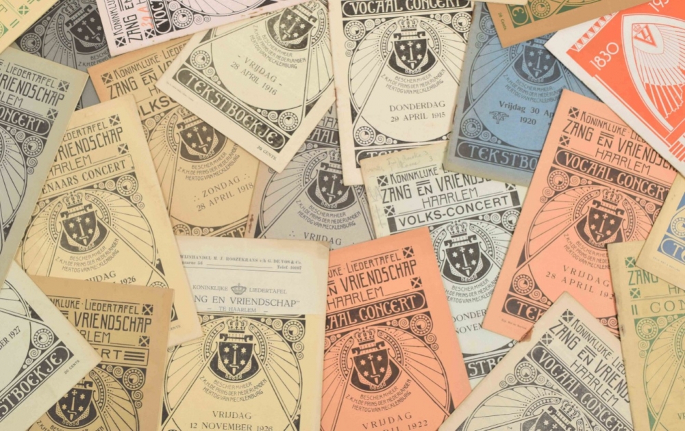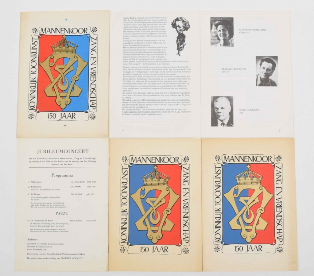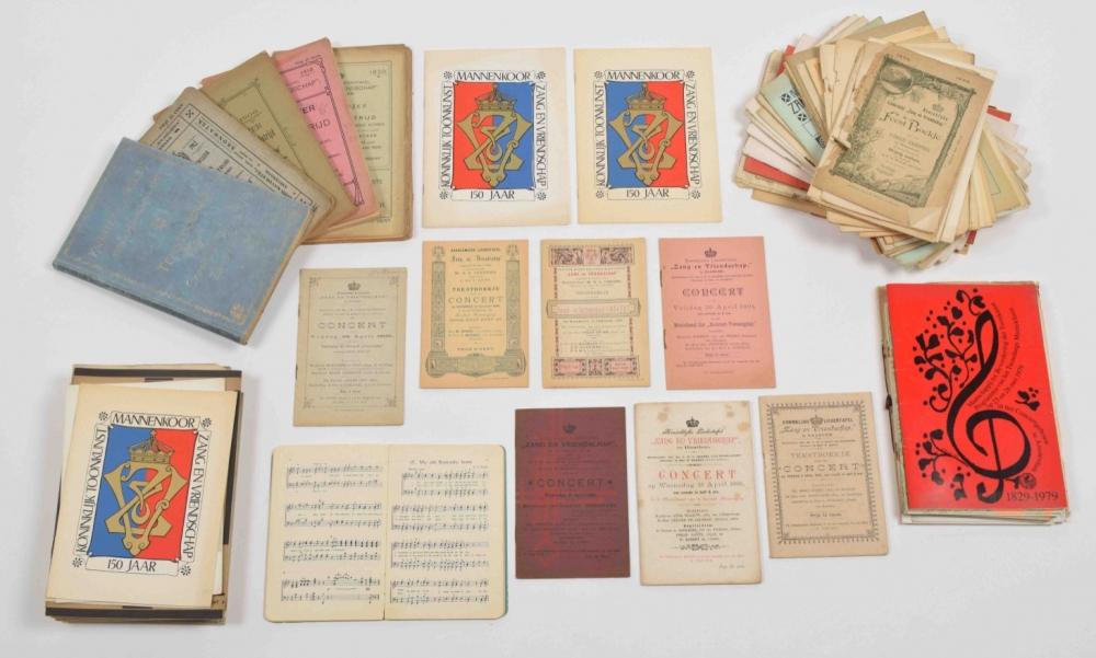 Mostly concerning Koninklijk Toonkunst Mannenkoor "Zang & Vriendschap" and Koninklijke Liedertafel "Zang & Vriendschap". From 1890 to 1980, mostly first half 20th century. Between 16 x 10.5 cm and 24 x 16 cm. Incl. booklets for Feestwijzer voor den Zangwedstrijd of 1890, 1900, 1910 and 1920. A few duplicates. Most in good condition, some with loosening wrappers.