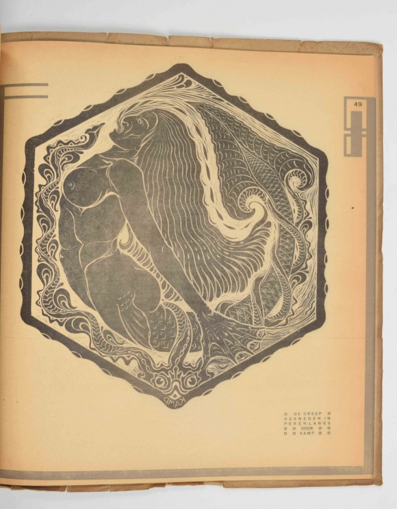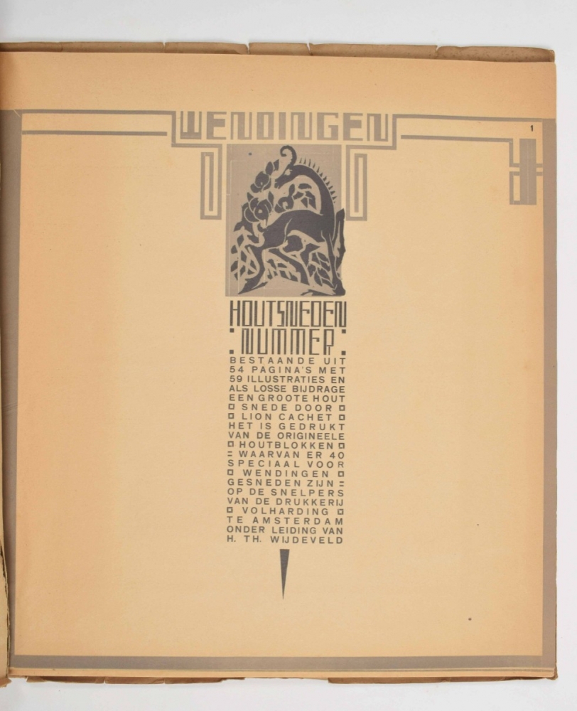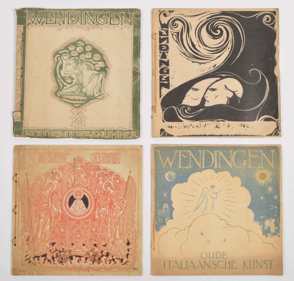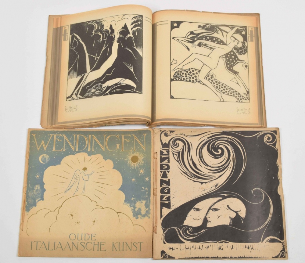 Ed. by H.Th. Wijdeveld. Raffiabound. No. 7/8 Houtsnedenummer. Lacking the fold-out by Lebeau, incl. Mankes. Cover worn, intern. good + 1919 no 11. Cover design Hildo Krop + 1929 no. 9 Oude Italiaansche kunst. Cover design Jan Poortenaar + 1928 no.12. Russische Ikonen. Cover design K. Katnov. de luxe ed. but cover in poor condition.