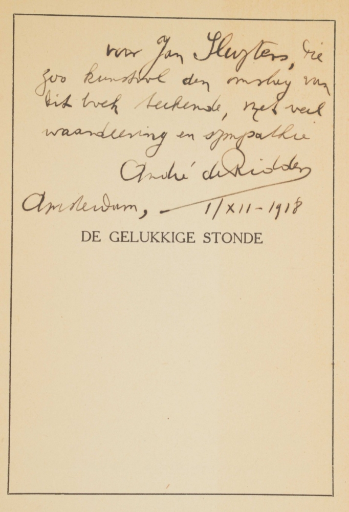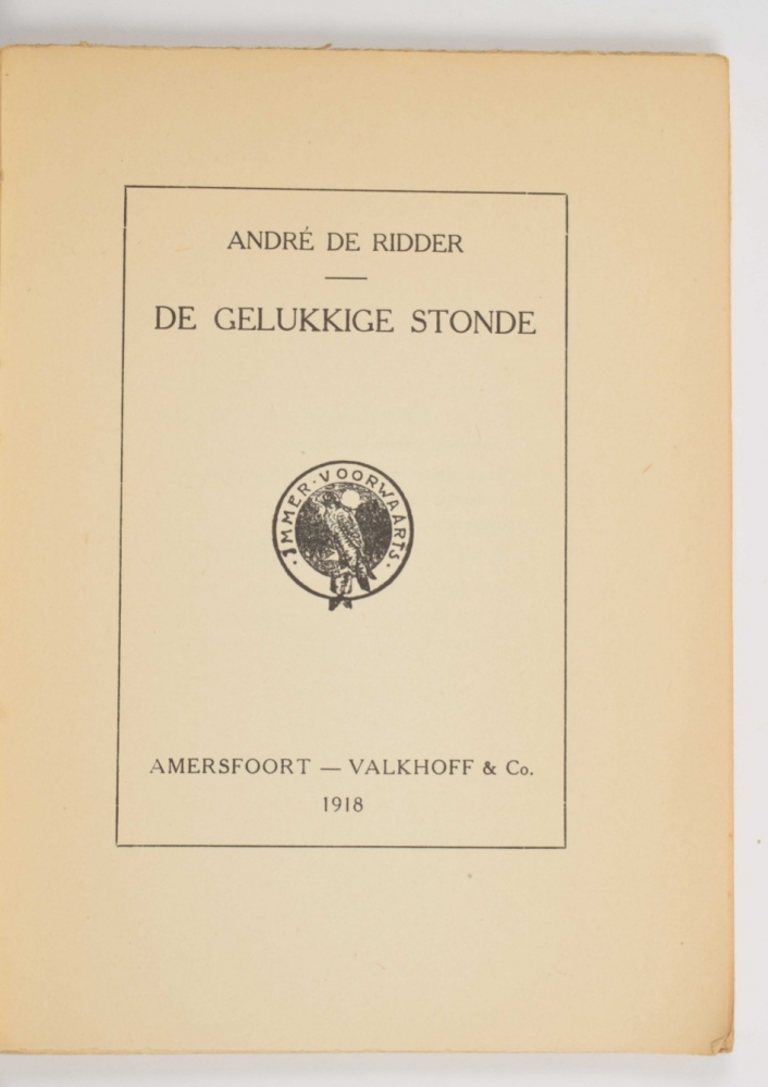 Amersfoort, Valkhoff & Co., 1918. Sewn. Presentation copy to Jan Sluijters, who designed the cover. Sluiters's signature in pencil on upper flyleaf. Half title inscribed by De Ridder in pen to Sluijters, dated 1 November 1918. Front cover loose and with tear.