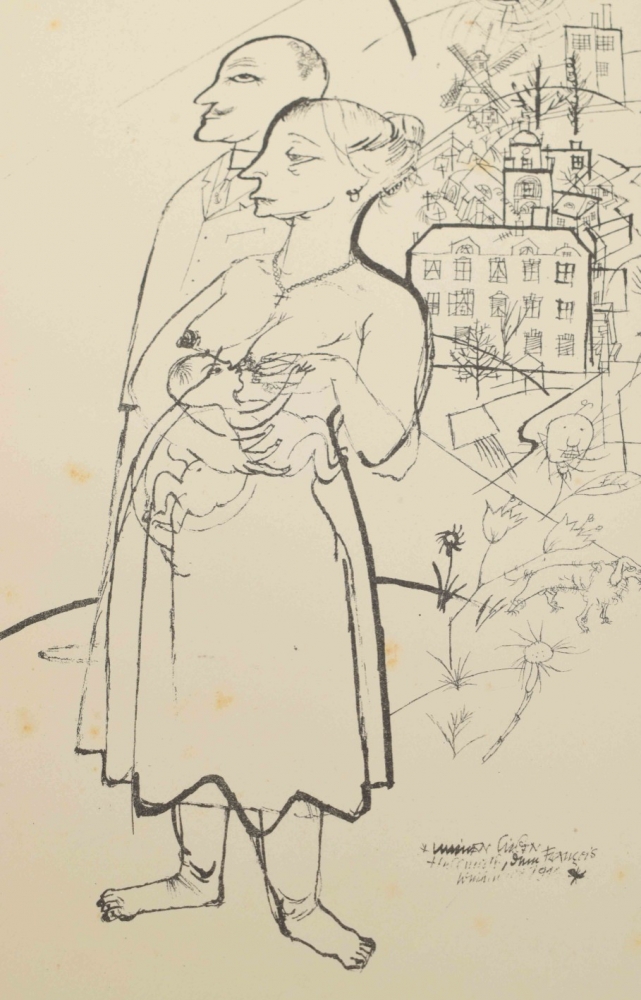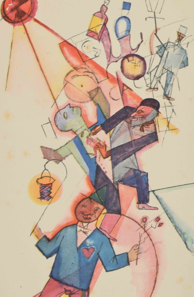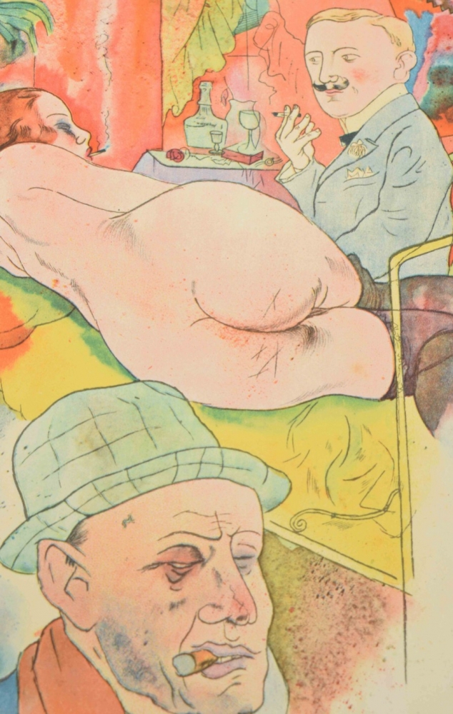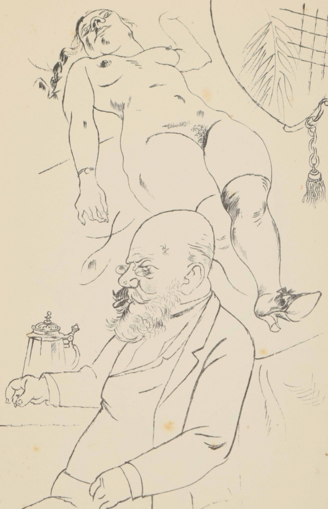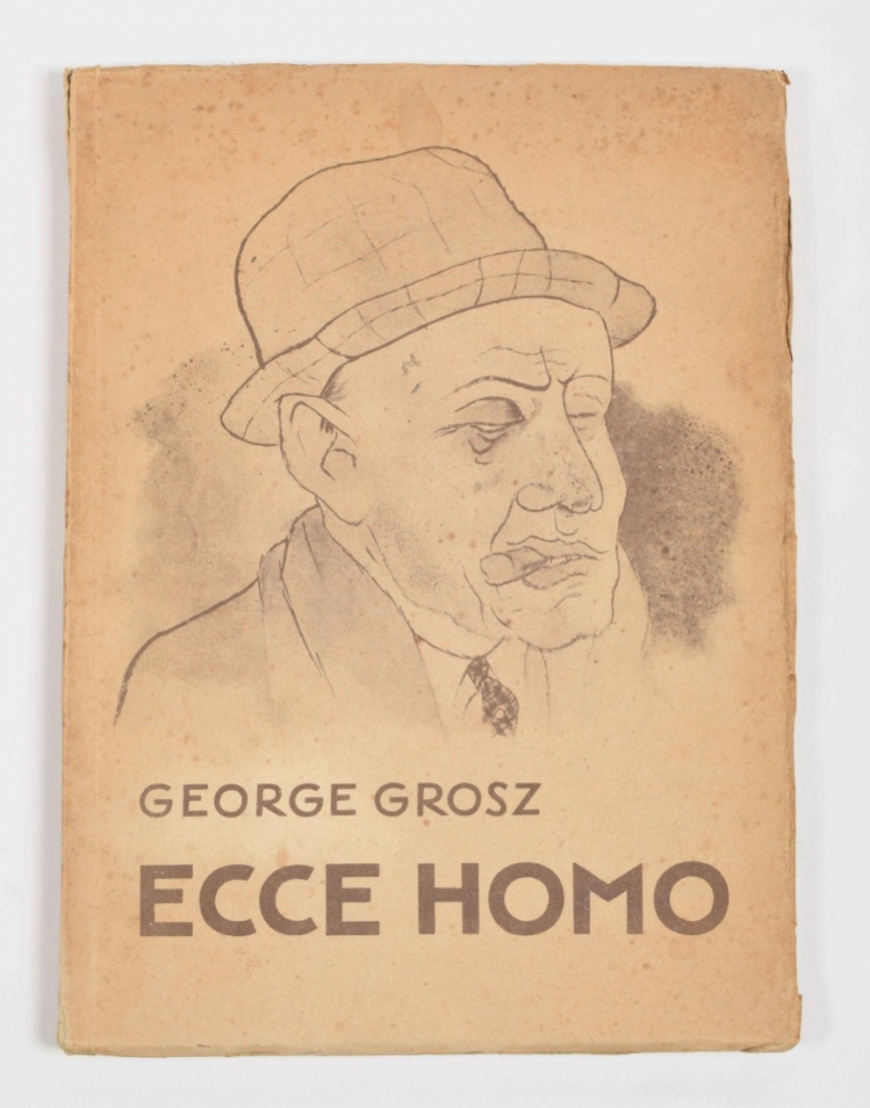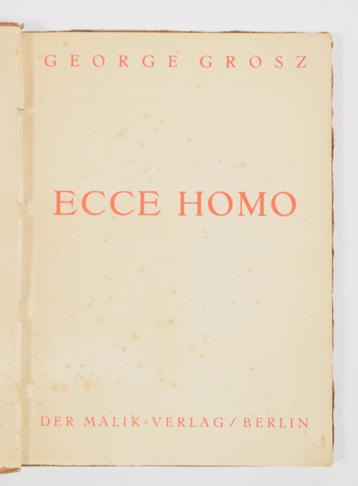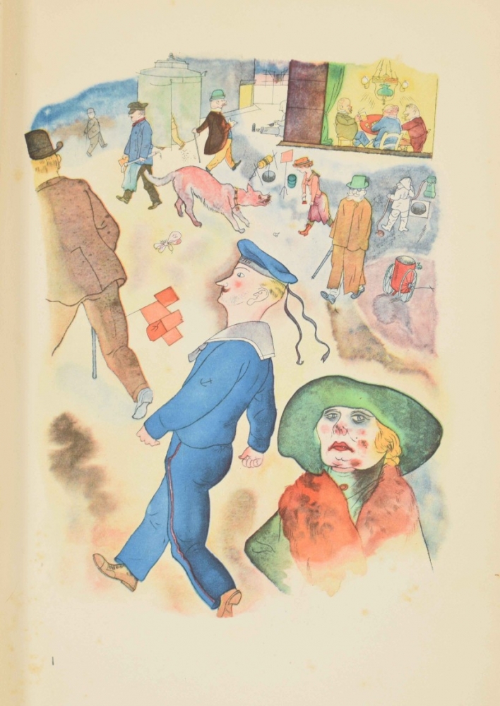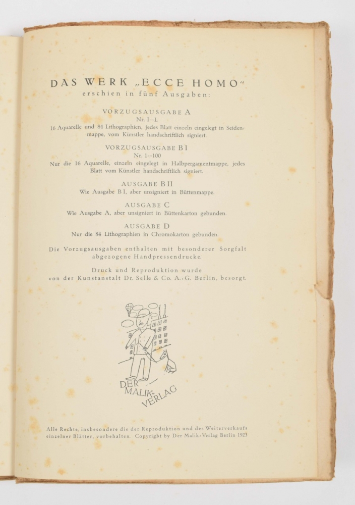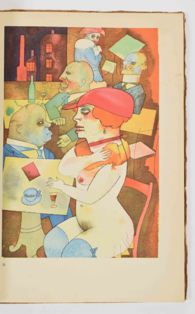 Berlin, Malik Verlag, 1923. Complete with title, table of Aquarelles, 100 plates including 16 in color, and publishers leaf. Foxed (as often), orig. paper wrappers with some fraying around edge, small tear in endboard.