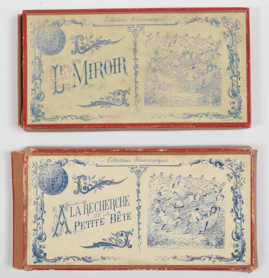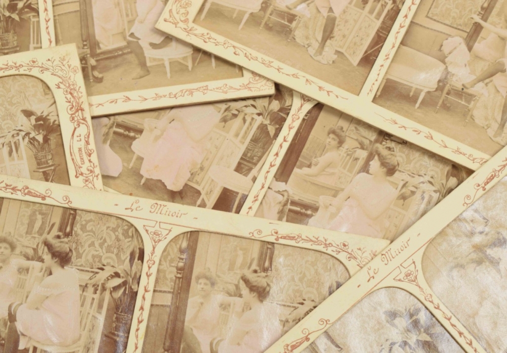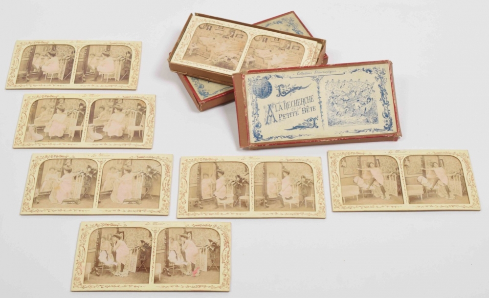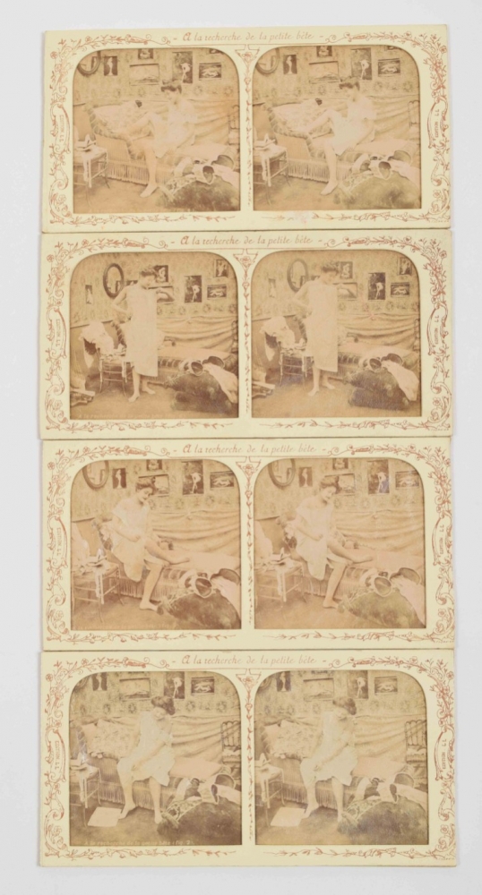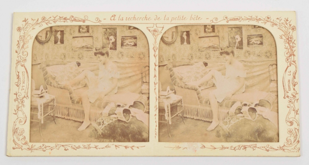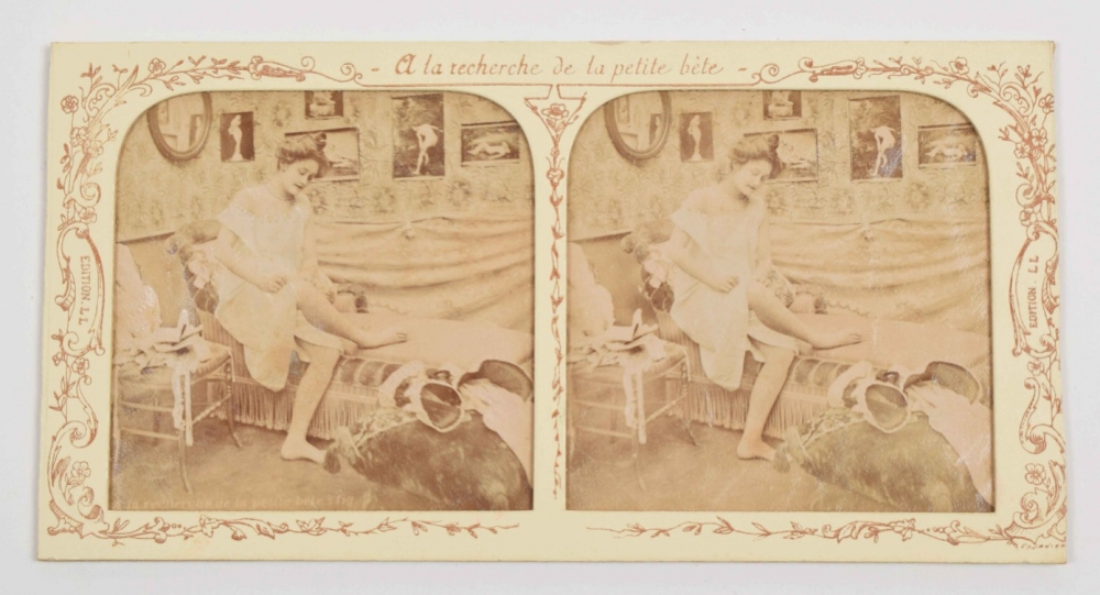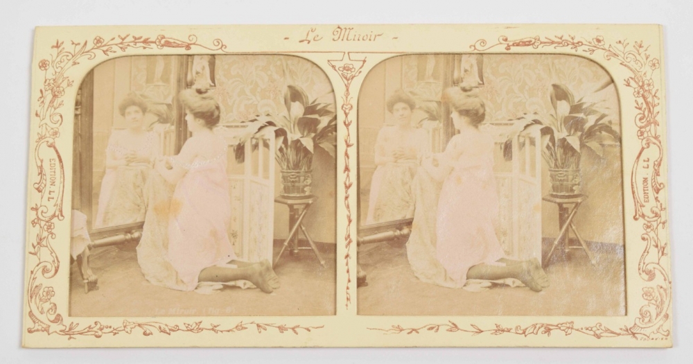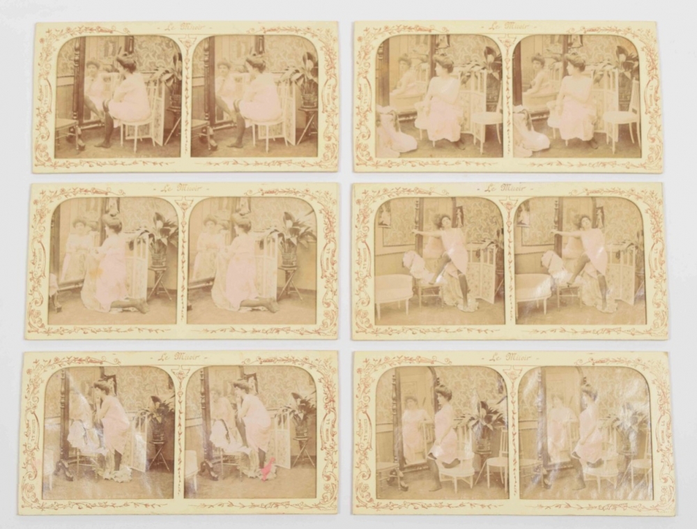 Collections Stéréoscopiques. Edite L L. F. Fournier, c. 1900. 6 erotic stereocards in orig. box. The handcoloured plates playfully show different stages of a lady dressed in a nightgown going to bed + Le Miroir (same series). Showing a lady dressed in a nightgown in front of a mirror. 6 stereocards in orig. box.