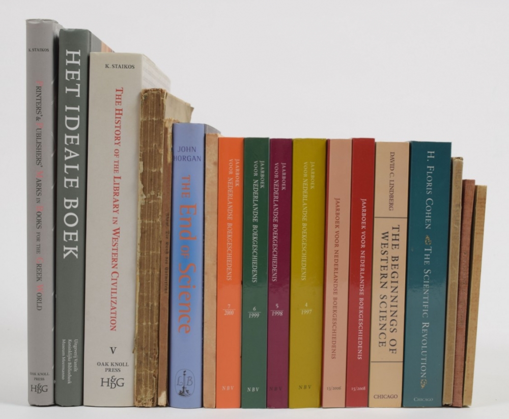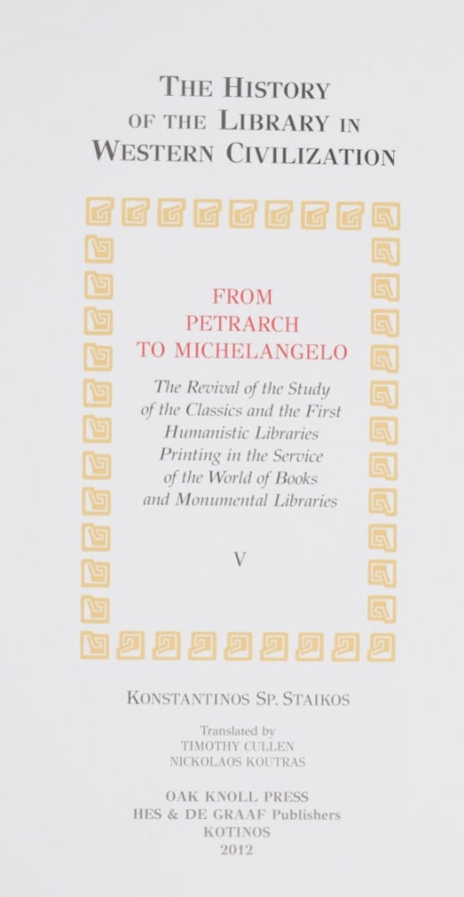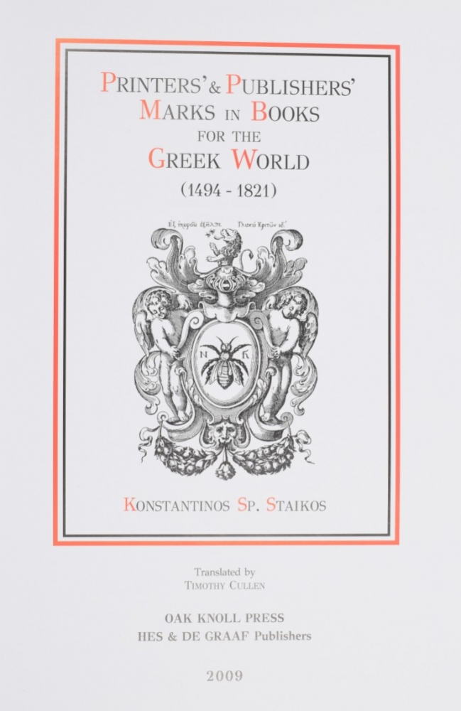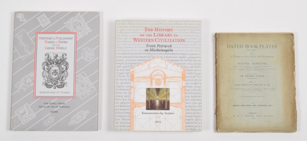 From Petrarch to Michelangelo. Konstantinos Staikos. New Castle, Oak Knoll Press, 2012 + Printers' & publishers' marks in books for the Greek world. Konstantinos Staikos. New Castle, Oak Knoll Press, 2009 + Dated book-plates (ex libris) with a treatise on their origin and development. Walter Hamilton. London, A. & C. Black, 1895 - and 15 more.