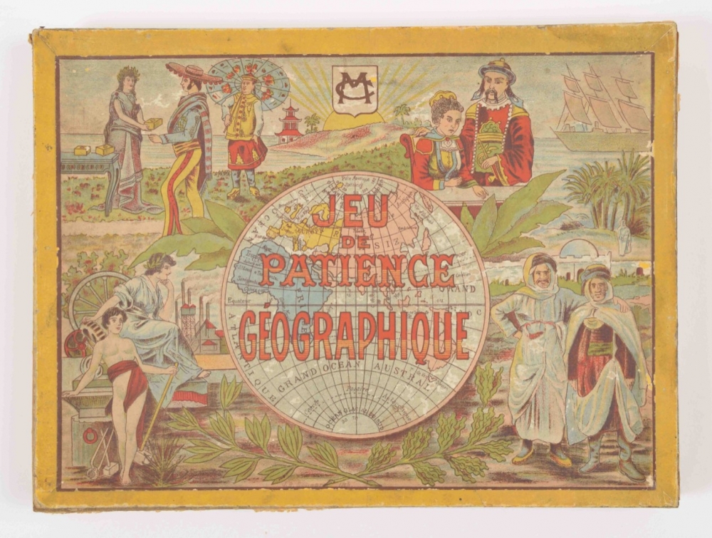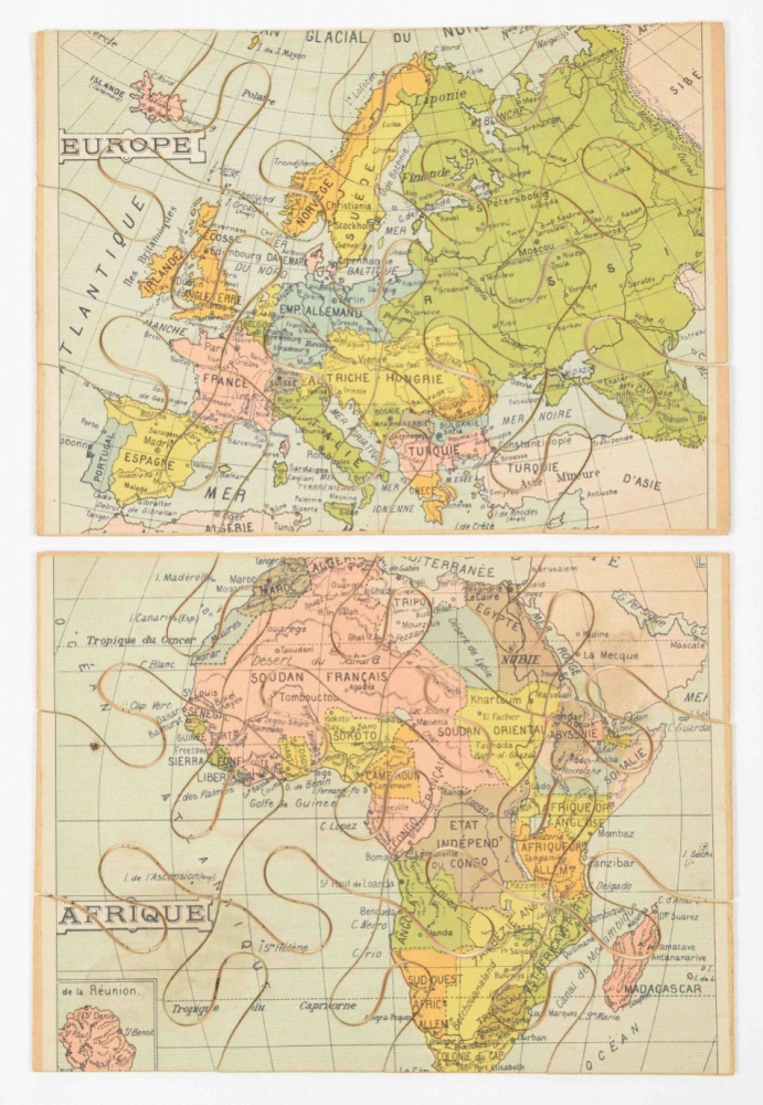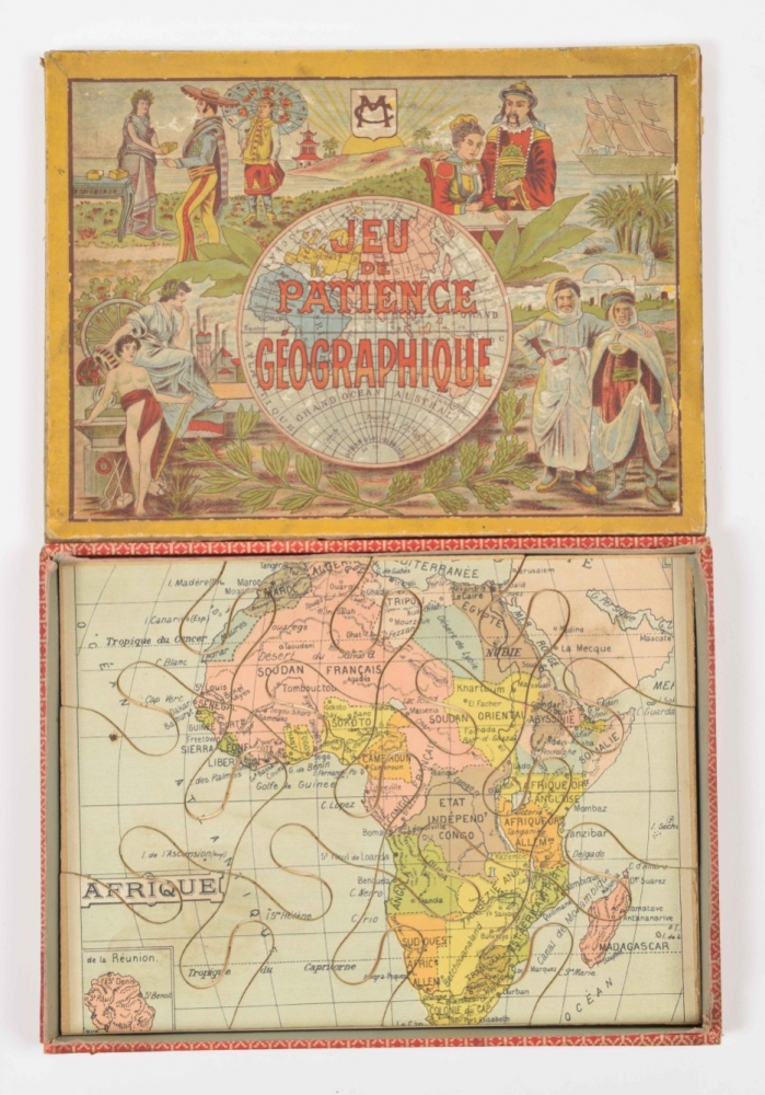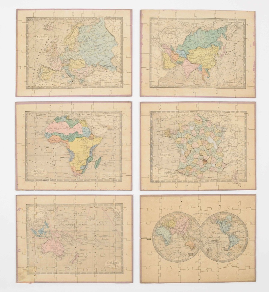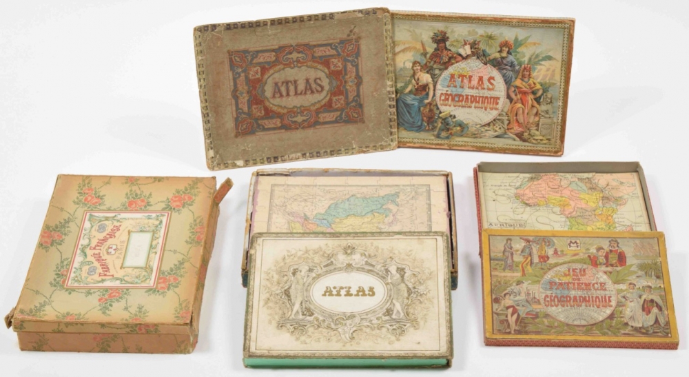 Jeu de Patience Geographique. Set with 4 complete puzzles, each with 12 pcs., 20 x 27 cm: Africa, North & South America, Asia and Europe. In original lithographed box. A few pieces dam., else good + Atlas. Set with 7 handcoloured puzzles, each with ± 36 pcs., 24 x 31.5 cm: world, Africa, South America, Asia, Europe, Oceania and France. Except for France the puzzles are complete. In orig. (dam.) box - and 3 other sets with 5 complete and 3 incomplete puzzles.