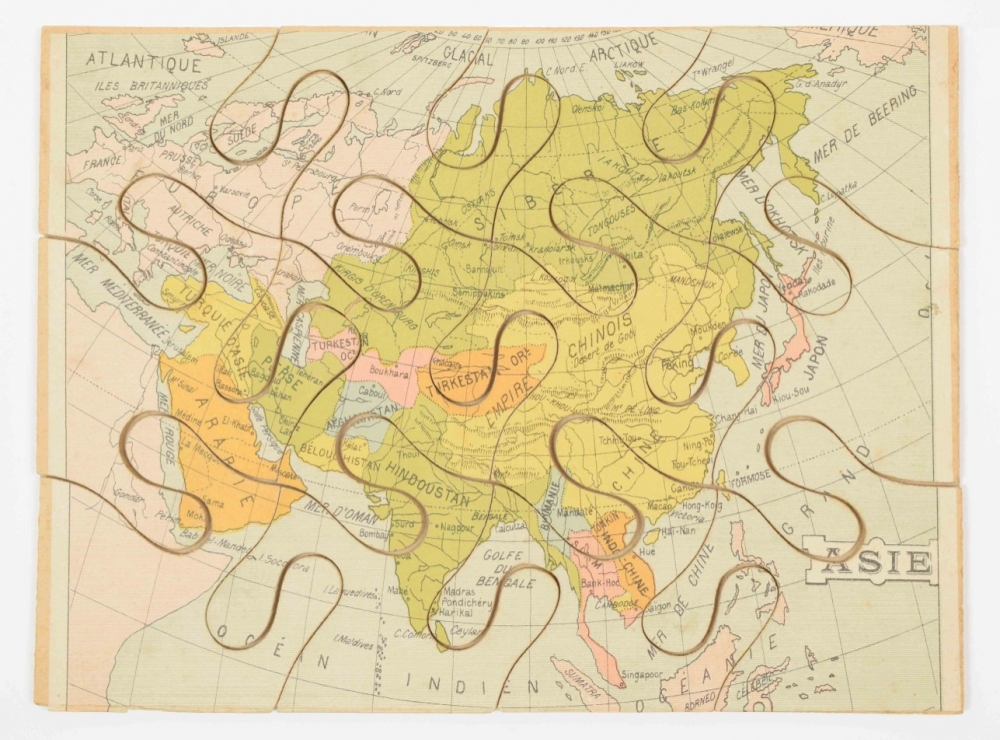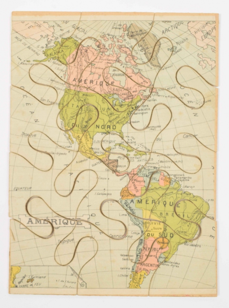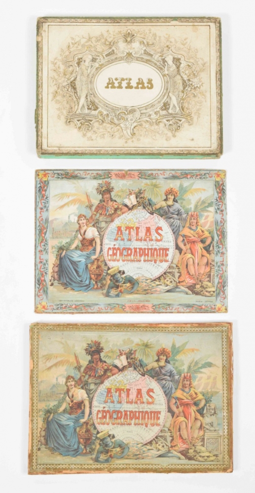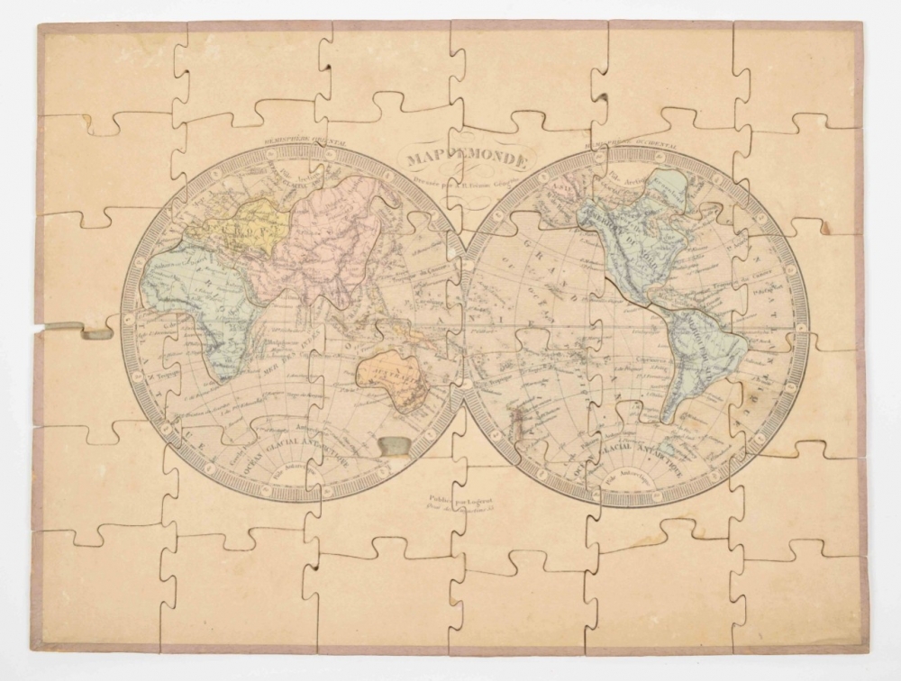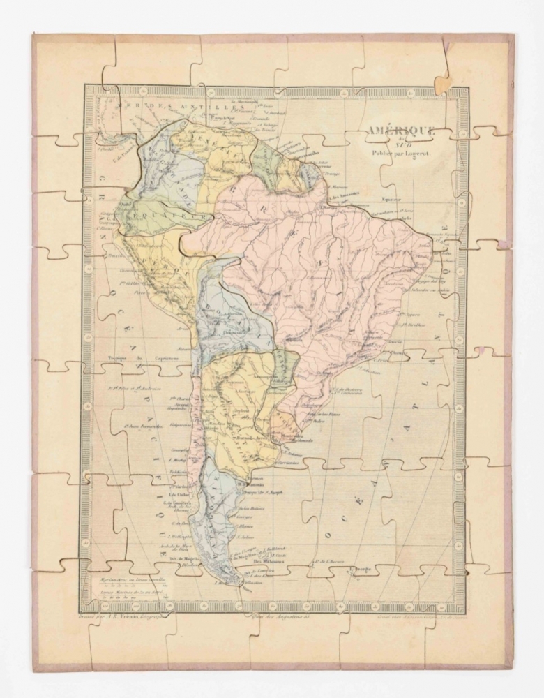 Jeu de Patience Geographique. Set with 4 complete puzzles, each with 12 pcs., 20 x 27 cm: Africa, North & South America, Asia and Europe. In original lithographed box. A few pieces dam., else good + Atlas. Set with 7 handcoloured puzzles, each with ± 36 pcs., 24 x 31.5 cm: world, Africa, South America, Asia, Europe, Oceania and France. Except for France the puzzles are complete. In orig. (dam.) box - and 3 other sets with 5 complete and 3 incomplete puzzles.