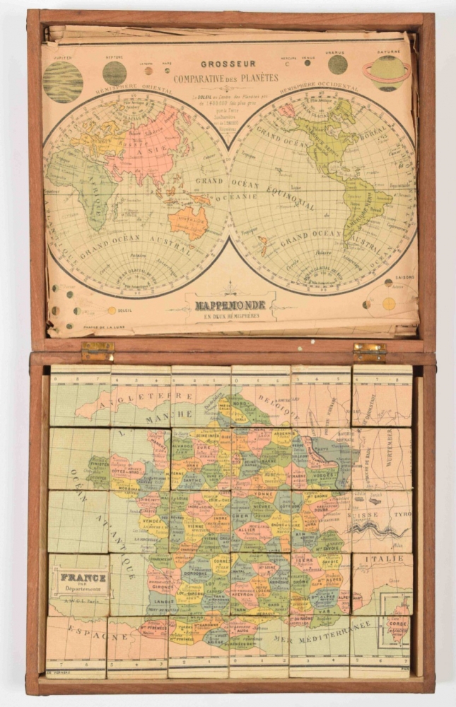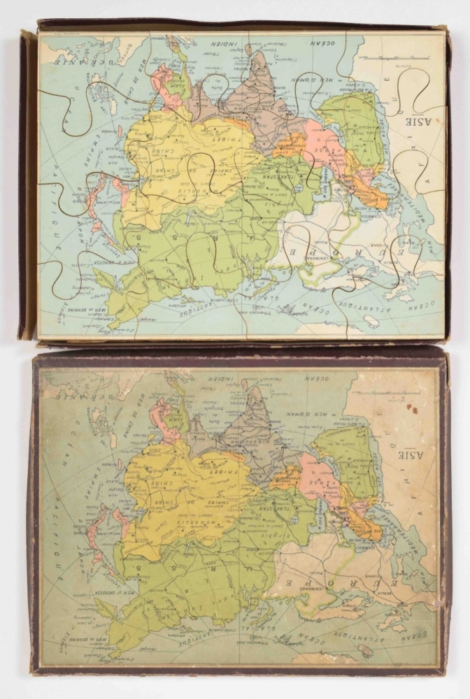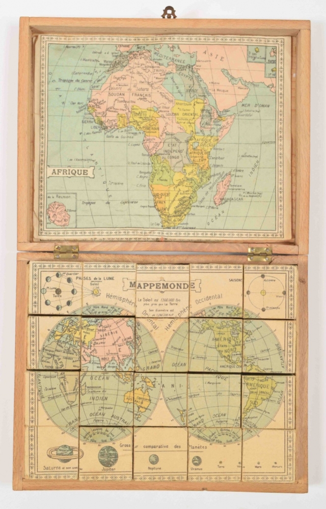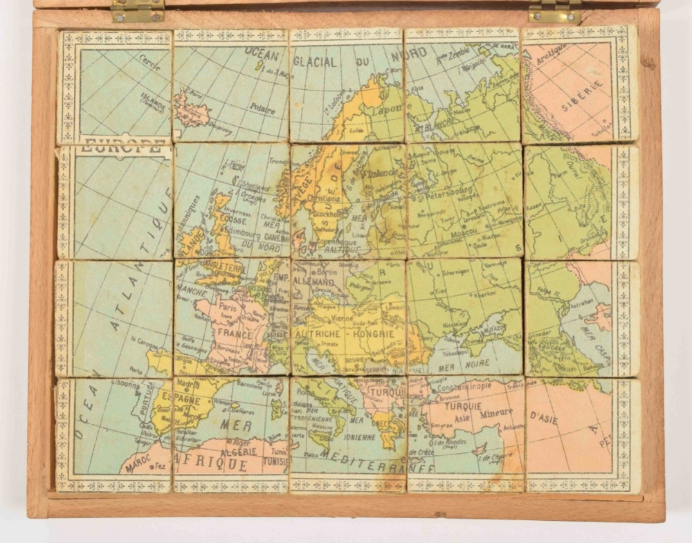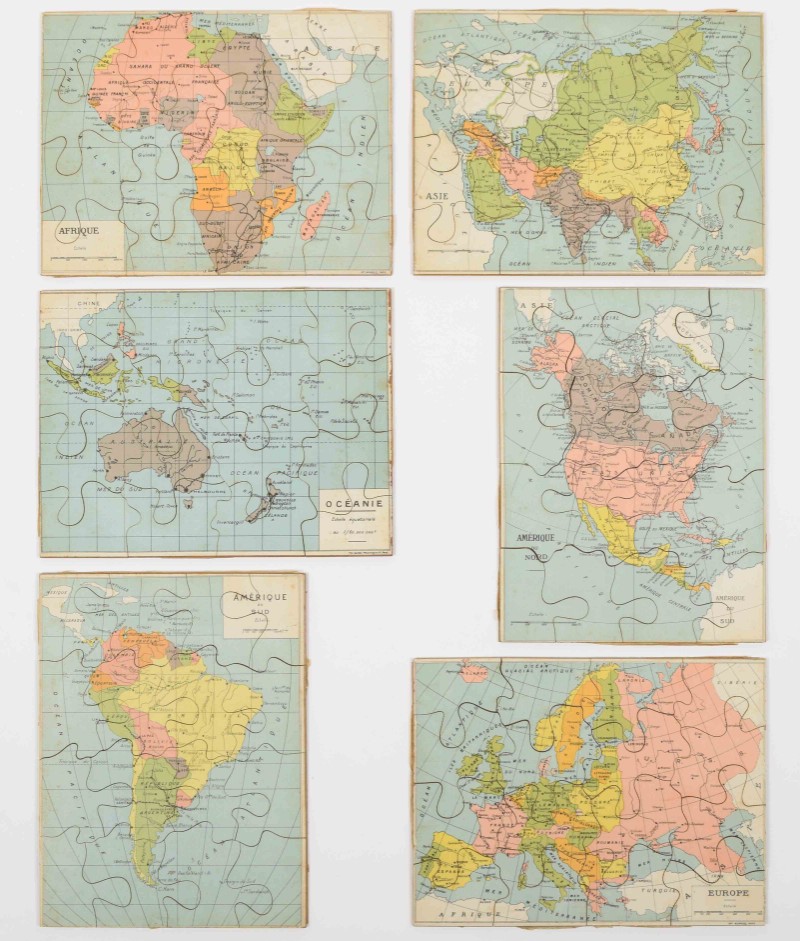 Homemade block puzzle set, complete with 30 blocks that make 6 lithographed maps, incl. 6 guide maps: France, Africa, North & South America, Asia, Europe and the world. C. 1910. In wooden case with 1 soiled guide map on lid. Maps and guide maps cut short to fit the blocks and case. 21 x 24.5 cm. Guide maps worn at the edges, puzzle in good condition + 1 similar set, complete with 20 blocks + 6 complete, plywood jigsaw puzzle maps of the continents. Paris, Monroco, c. 1930. Each 20 pcs., 22 x 29 cm - and 9 other sets of 20th-century jigsaw puzzle maps.