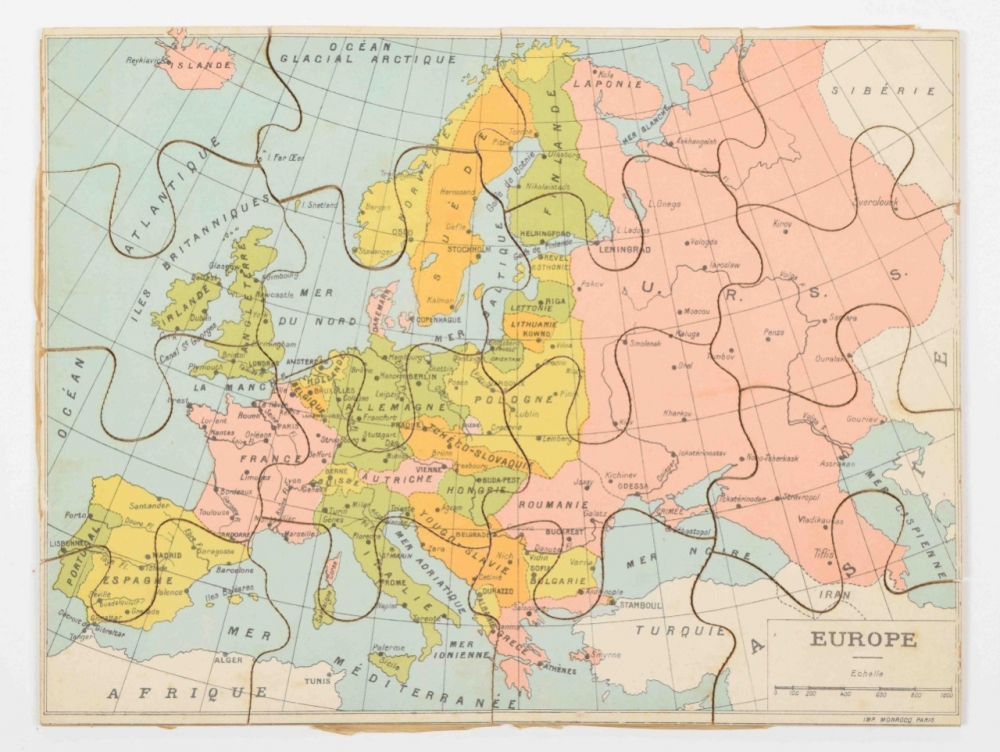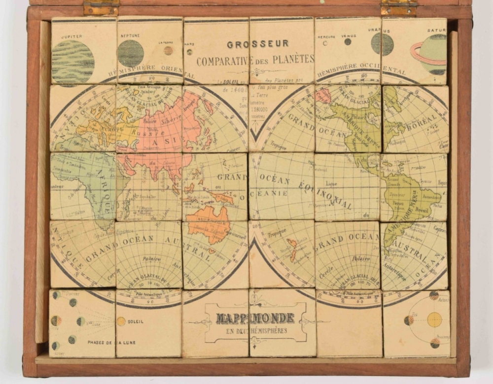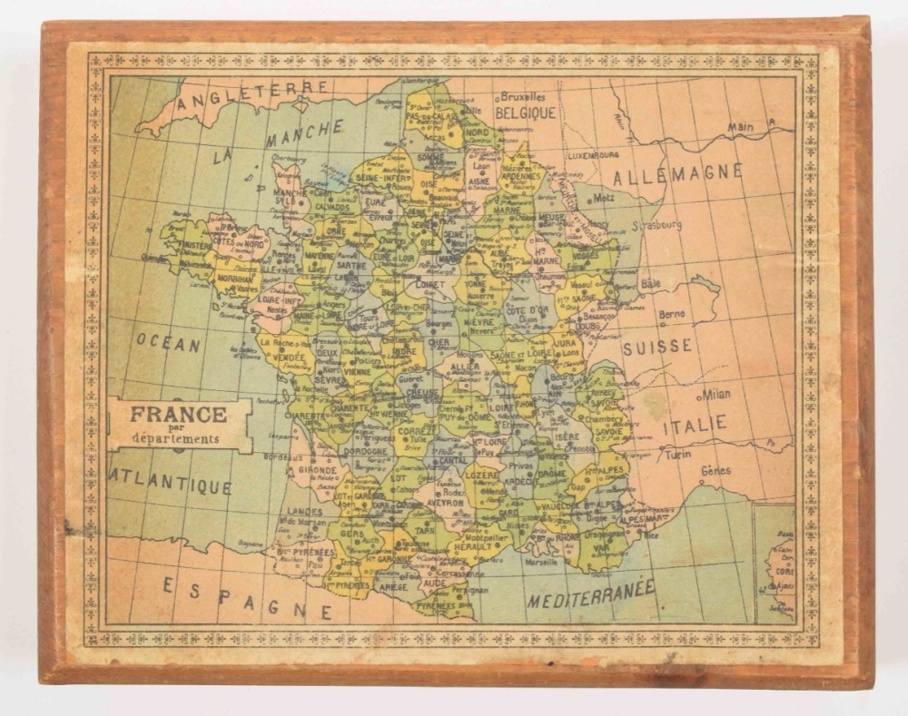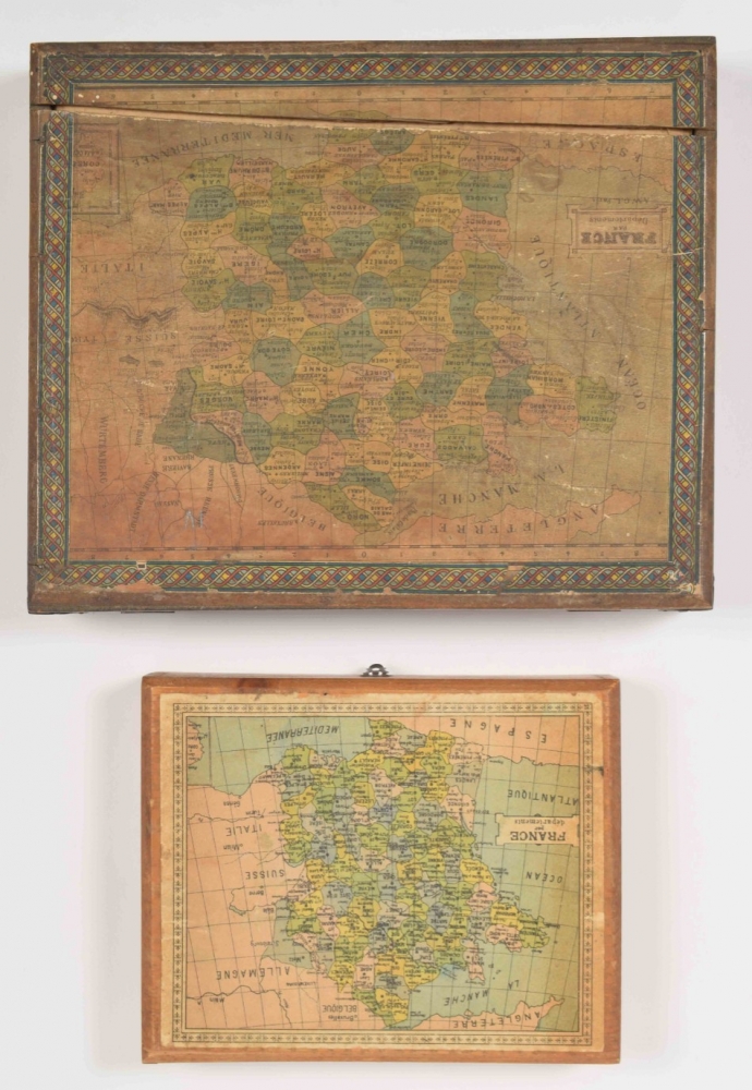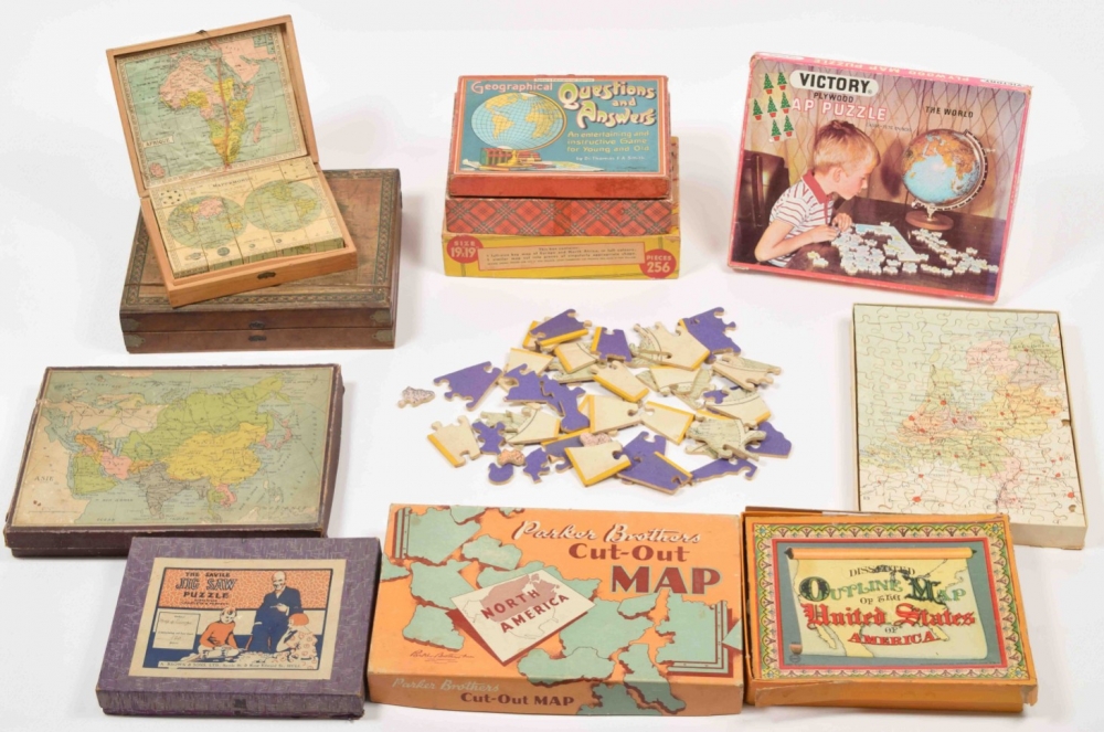 Homemade block puzzle set, complete with 30 blocks that make 6 lithographed maps, incl. 6 guide maps: France, Africa, North & South America, Asia, Europe and the world. C. 1910. In wooden case with 1 soiled guide map on lid. Maps and guide maps cut short to fit the blocks and case. 21 x 24.5 cm. Guide maps worn at the edges, puzzle in good condition + 1 similar set, complete with 20 blocks + 6 complete, plywood jigsaw puzzle maps of the continents. Paris, Monroco, c. 1930. Each 20 pcs., 22 x 29 cm - and 9 other sets of 20th-century jigsaw puzzle maps.