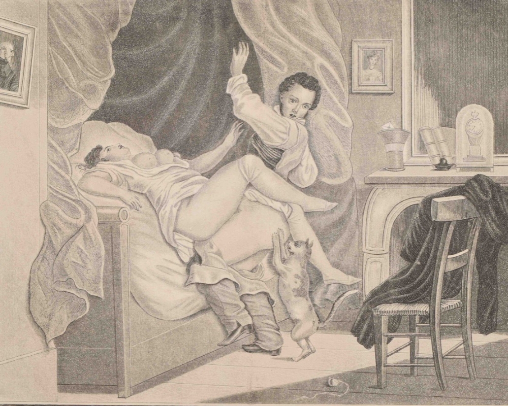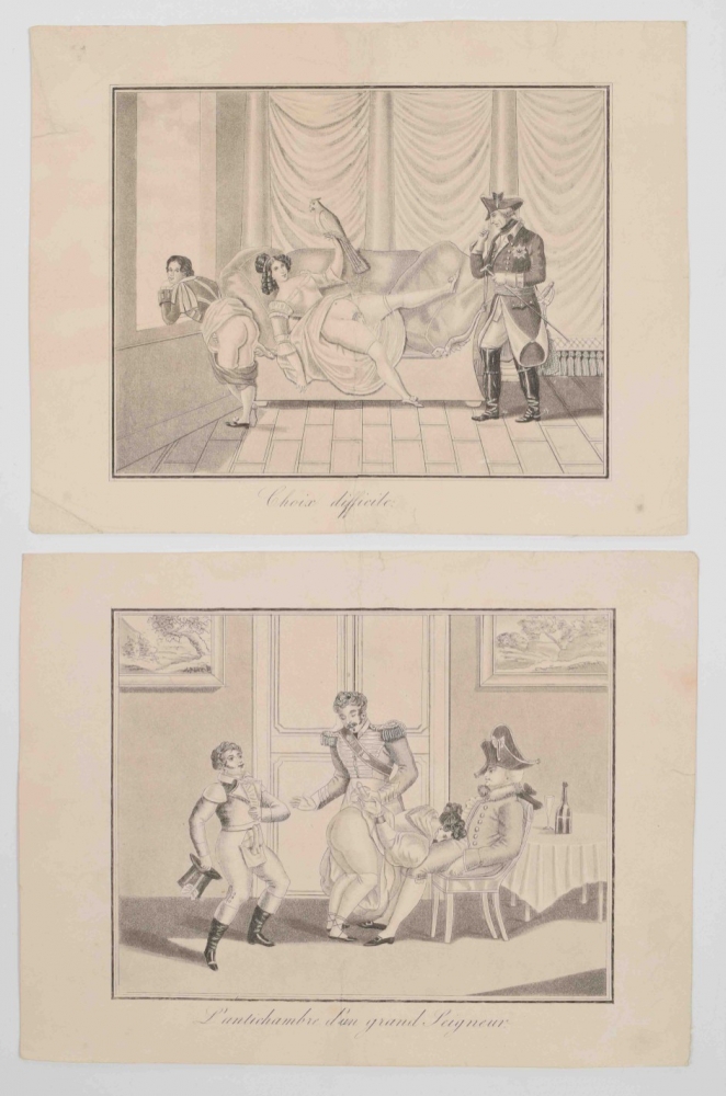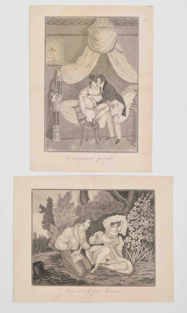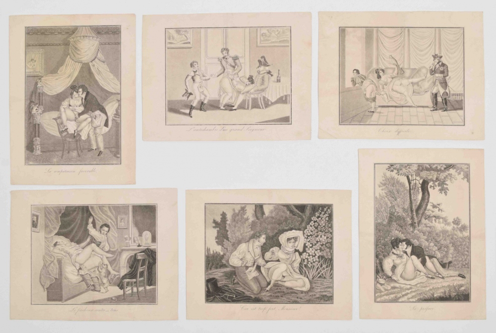 Lot of 6 steel engravings. ± 18 x 23 cm, France, first half 19th century. (1) L'antichambre d'un grand Seigneur. (2) Le facheux contre tems. (3) Ceci est trop fort, Monsieur. (4) La comparaison favorable. (5) La préface. (6) Choix difficile. Middle fold, verso blank. Good set.
