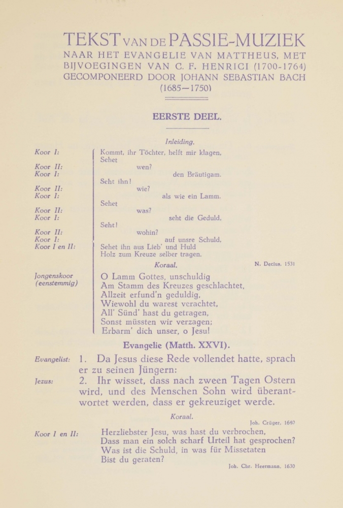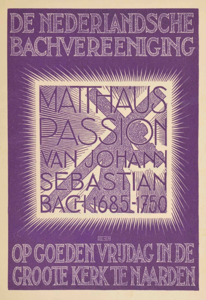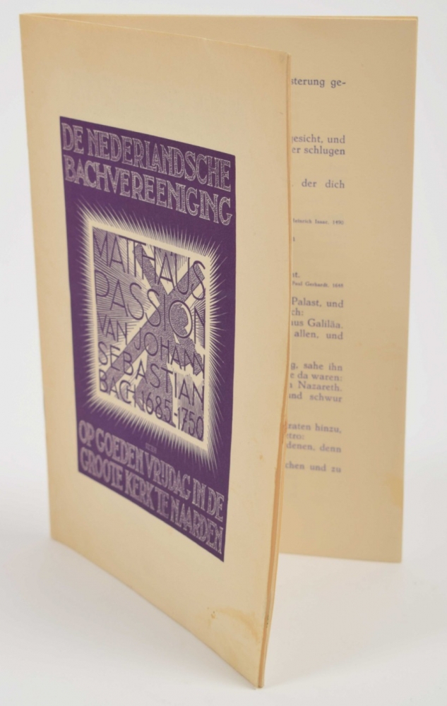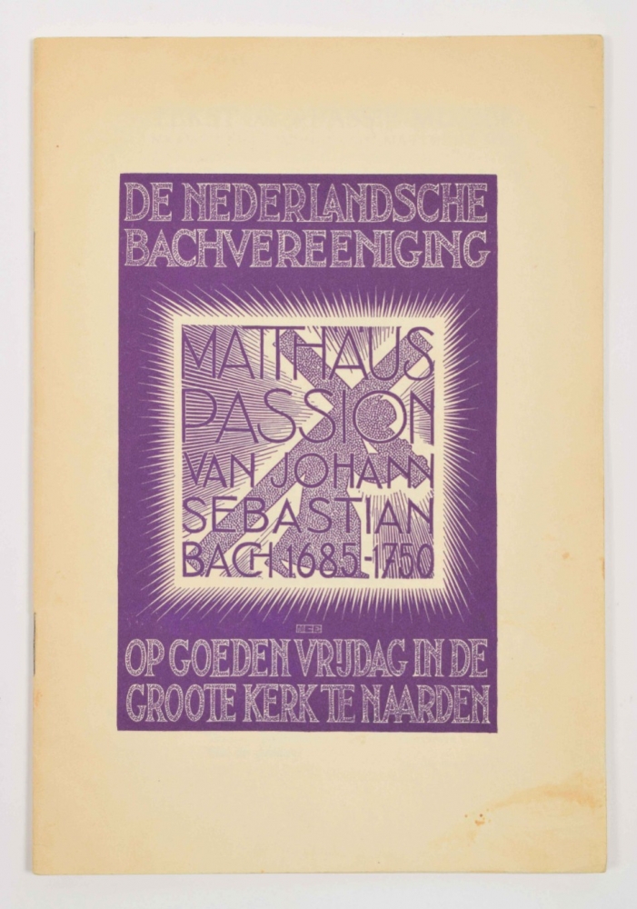 Matthäuspassion van Johan Sebastian Bach 1685-1750. Op goeden vrijdag in de Groote Kerk te Naarden. Amsterdam, printed by M.J. Portielje for D.N.B., no date (1938 or later), (23) p., original stapled wrapper in purple printed with woodcut by Escher with printed monogram. (=Bool/ Locher 302)
