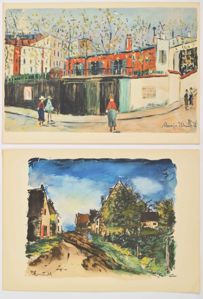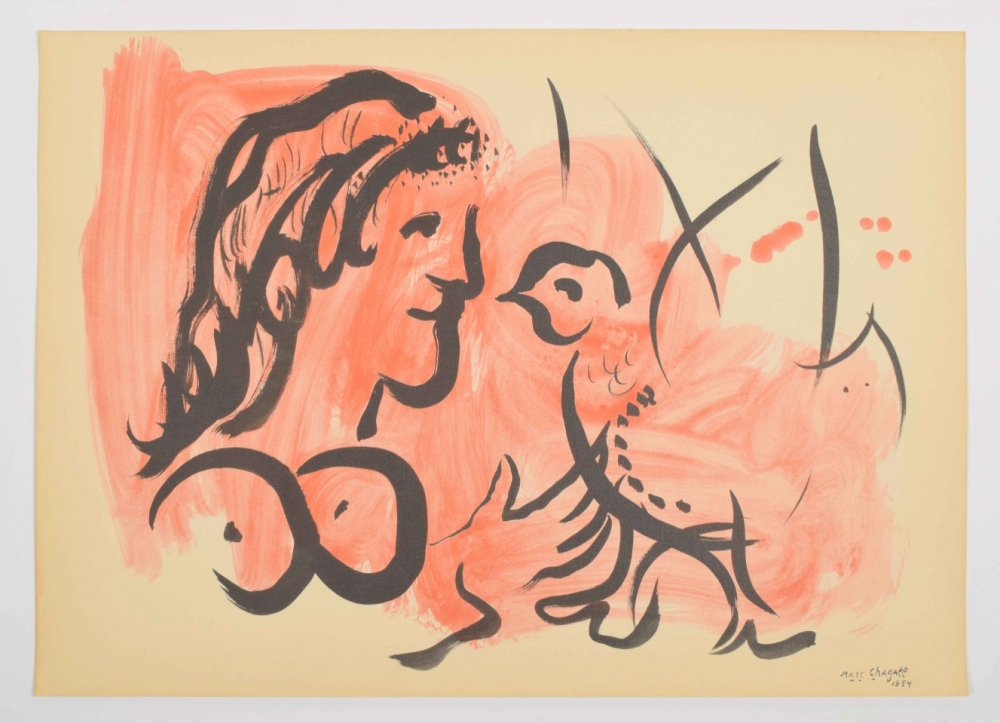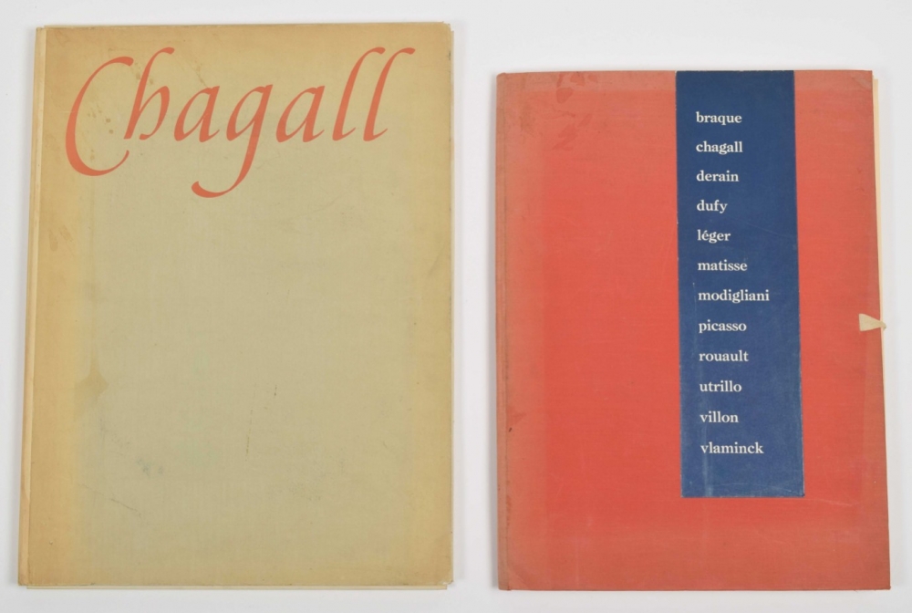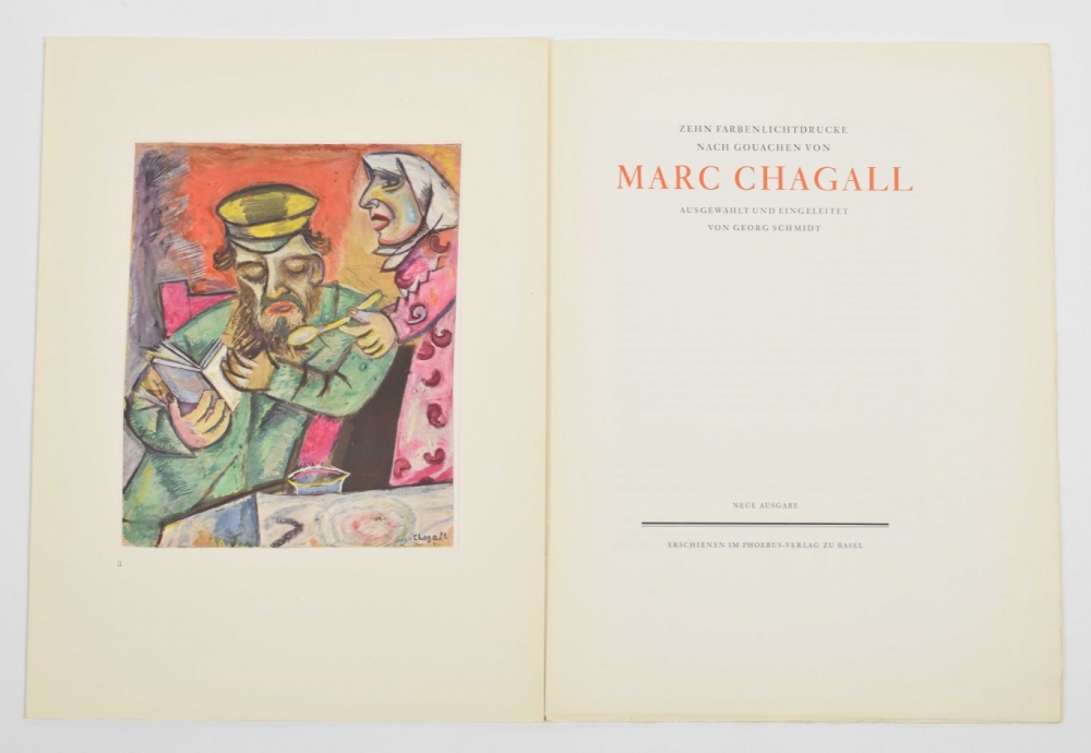 éditions d'art du Lion. Paris, 1959. One of 970 numbered copies. Loose plates and sheets in orig. cloth portfolio. With 12 colour plates, of which some with pochoir, in lettered tissue folio sheets (lacking the picasso tissue sheet, but including the plate). Portfolio discoloured and worn, text and plates fine. Added: Marc Chagall. Zehn Farbenlichtdrucke nach Gouachen von Marc Chagall. Ausgewählt und eingeleitet von Georg Schmidt. Neue Ausgabe, Phoebus-Verlag, Basel, 1958. 10 loose plates in (stained) cassette. Folio.