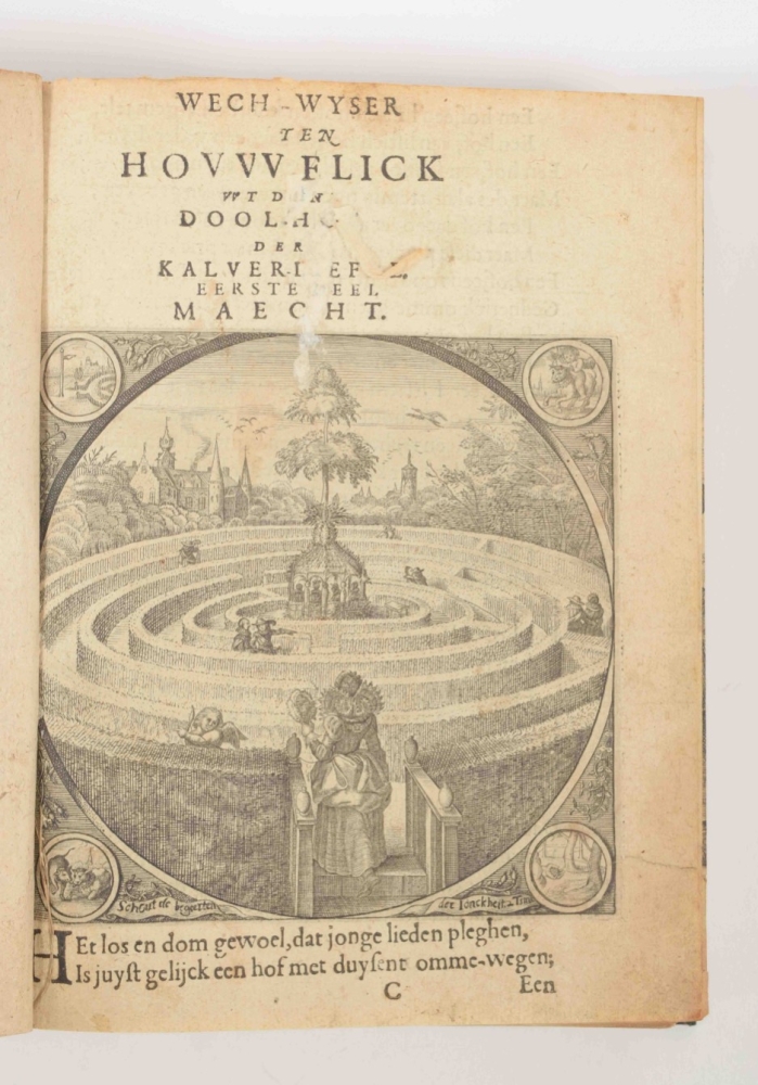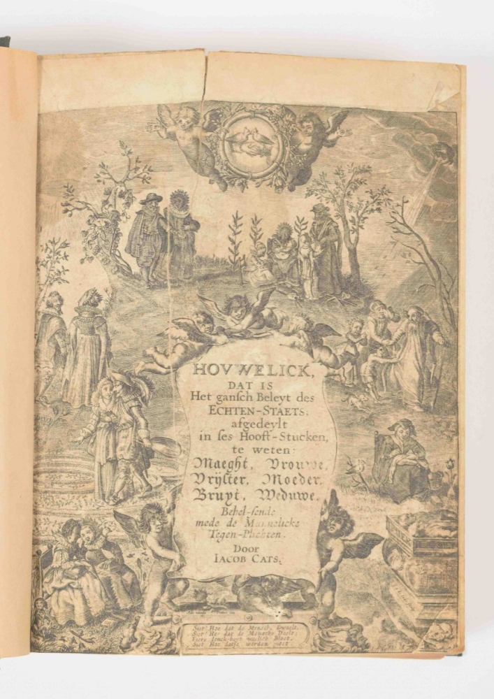 Jacob Cats. (Zeeland, Berentsma, 1633?). 7 parts in 1 vol. (15),38,(8),67,(29),35,(1),(18),(1),132 (=134),(4(misbound pp. quire yyy)), (7), 72(=62), (18), 76, 39, (24) pp. 2 engraved frontispieces and ± 50 engr. ills. in the text. Rebound in green cloth, gilt title on spine.