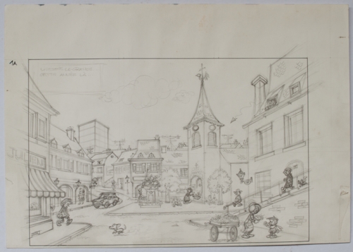 See the Dutch description: Grote en prachtig uitgewerkte potloodtekening van Steven Sterk. "Livesote la Grande..Cette année là..." Met ook Gargamel en Azrael die van de trap af komen. 25,5 x 36,5 cm.