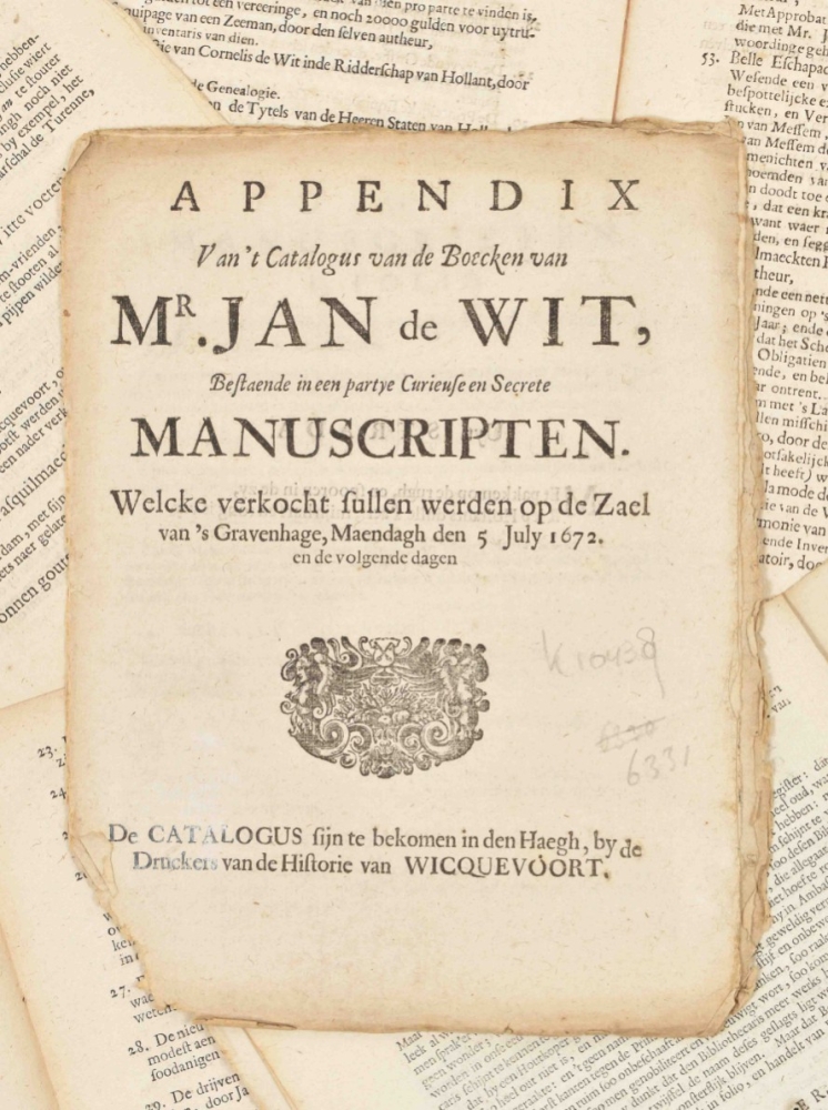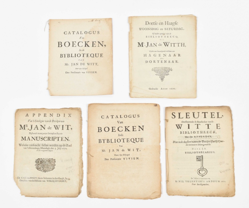 Knuttel 10345; (2) Catalogus van boecken, in de byblioteque van Mr. Jan de Witt, door zyn discipel den pensionaris Vivien. Almost the same pamphlet as (1), also without address, but differing in details, threadbound, sm. 4to. Waterstained; (3) Appendix van 't Catalogus van de boecken van Mr. Jan de Wit, bestaende in een partye curieuse en secrete manuscripten. Welcke verkocht sullen werden op de zael van 's Gravenhage, maendagh den 5 july 1672 en de volgende dagen. De catalogus sijn te bekomen in den Haegh, by de druckers van de historie van Wickevoort. N.pl., n.publ., 1672, 8 p., selfwrapping, sm. 4to. Dam. in lower margin, minimally affecting the text. Knuttel 10438; Tiele 6331; (4) Sleutel, ontsluytende de Boecke-kas van de Witte bibliotheeck, met sijn appendix. Waer in de duystere namen der boecken klaerlijck werden vertoont en bekent gemaekt. Door J.B. Bibliothecarius. The Hague, Nil Volentibus Arduum, 1672, 16 p., woodcut title vignette depicting a key, threadbound, sm. 4to. Knuttel 10442; Tiele 6334; (5) Dortse en Haagse woonsdag en saturdag, of nader opening van de bibliotheecq van Mr. Jan de Witth, zijnde een samenspraak tussen een Hagenaar en Dortenaar. N.pl., n.publ., "Gedruckt anno 1772", 10,(2) p., almost loose, sm. 4to. In 2 loose sheets, splitting on folds. Knuttel 10443. (total 5)