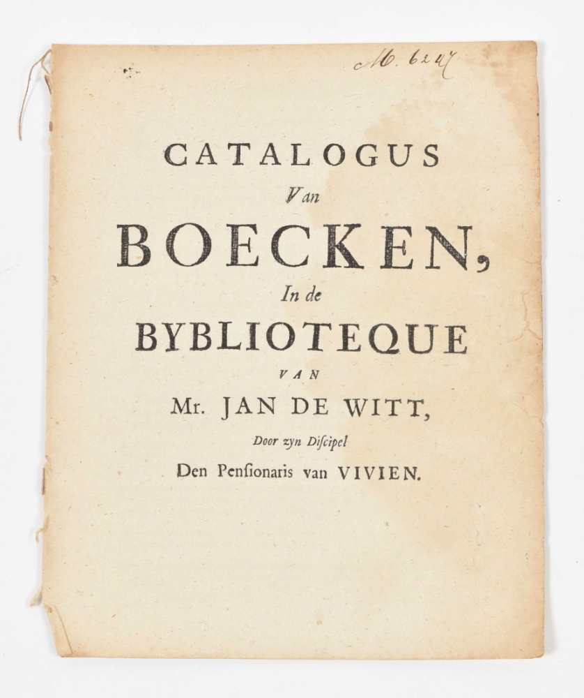 Inde byblioteque van Mr. Jan de Wit, door sijn discipel den pensionaris Vivien. N.pl., n.publ., n.d. (1672), (8) p., threadbound, sm. 4to.