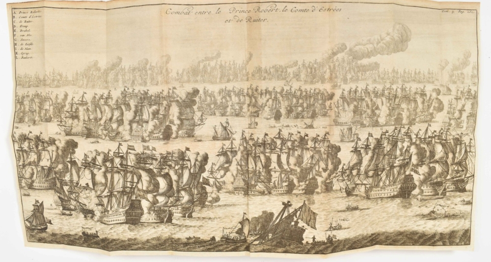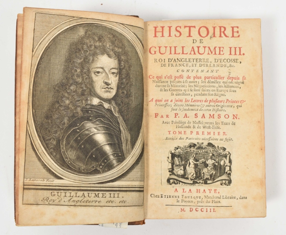 Roi d'Angleterre, d'Ecosse, de France et d'Irlande, &c. Contenant ce qui s'est passé de plus particulier depuis sa naissance jusques à sa mort (...). Par P.A. Samsom. The Hague, E. Foulque, 1703-1704, 3 vols., (14),473,(29); 476,(42); 478,(49) p., with engr. frontisp. portrait, 14 other portraits, engr. title vignettes, 3 (large) fold. maps and a large fold. view of a sea battle, contemp. unif. calf with gilt and ribbed spines, gilt board edges, 12mo.