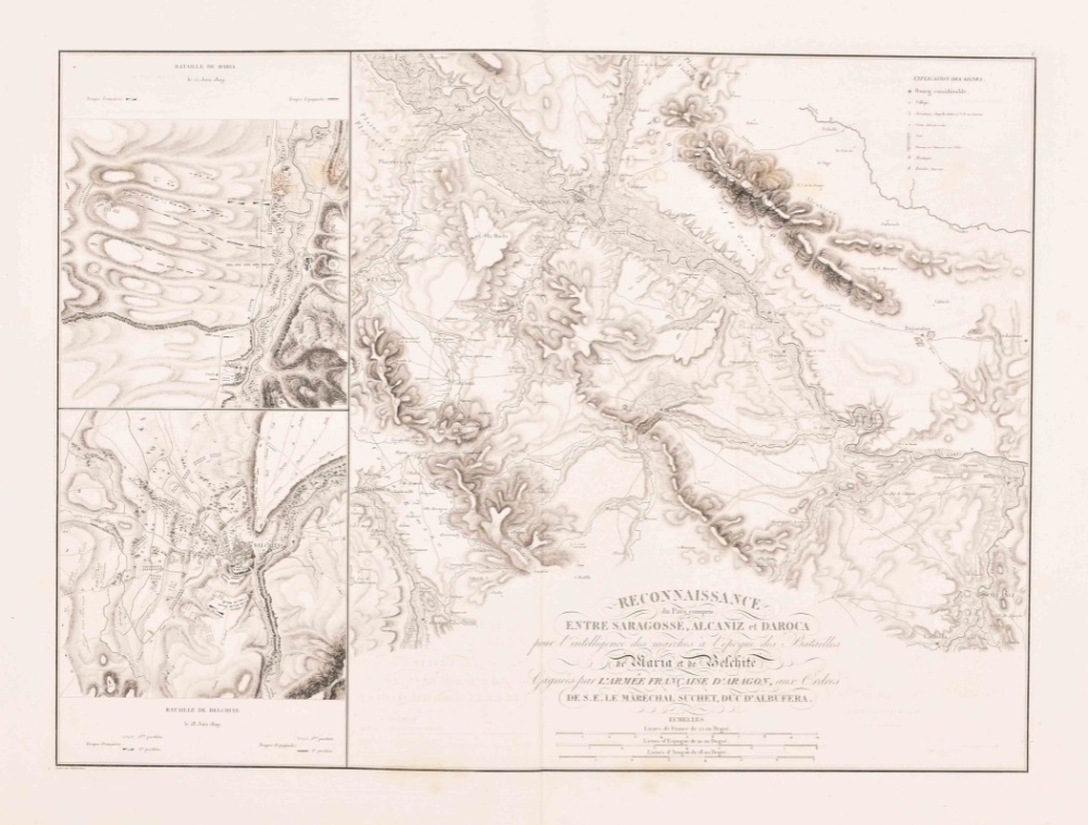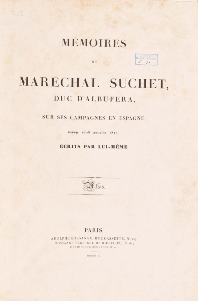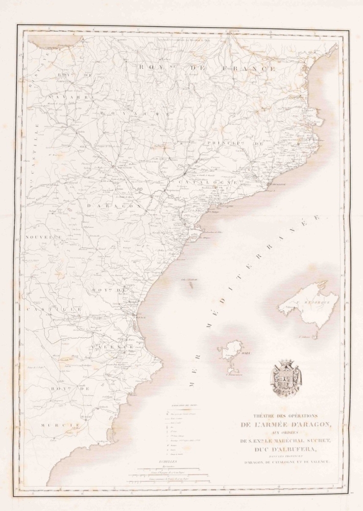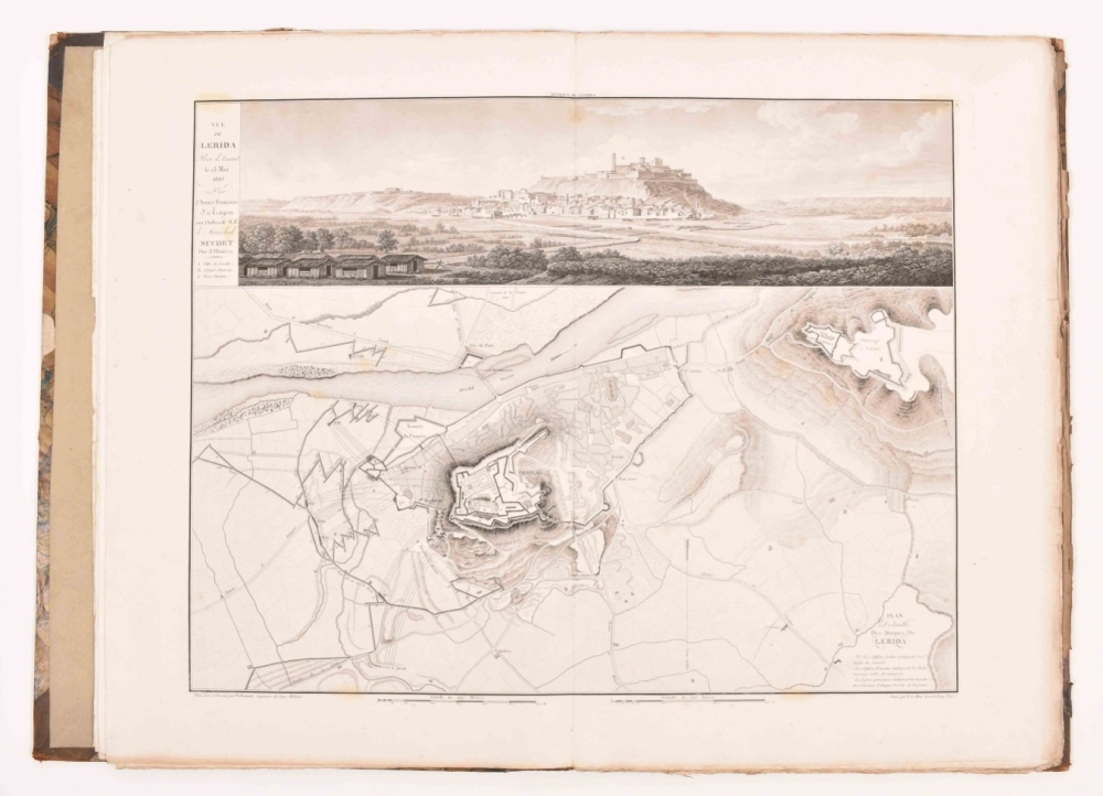 General map with title: Théatre des opérations de l'armée d'Aragon, aux ordres de S. Ex.ce le Maréchal Suchet, Duc d'Albufera, dans les provinces d'Aragon, de Catalogne et de Valence, several plans and views (incl. Lerida, Tarragona and Valencia) and several battles. Lacks last leaf. Portfolio worn, stamp on title page.