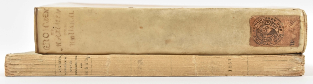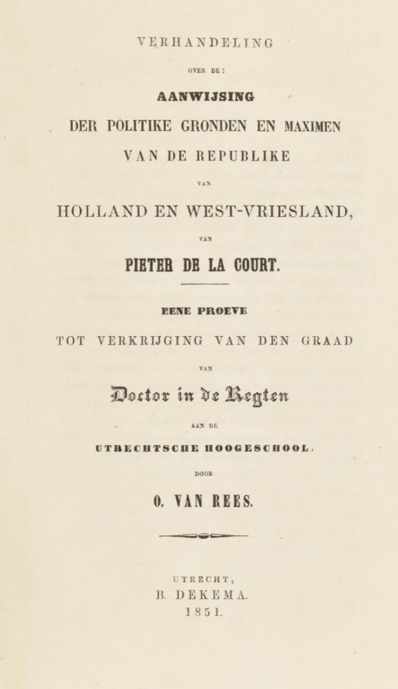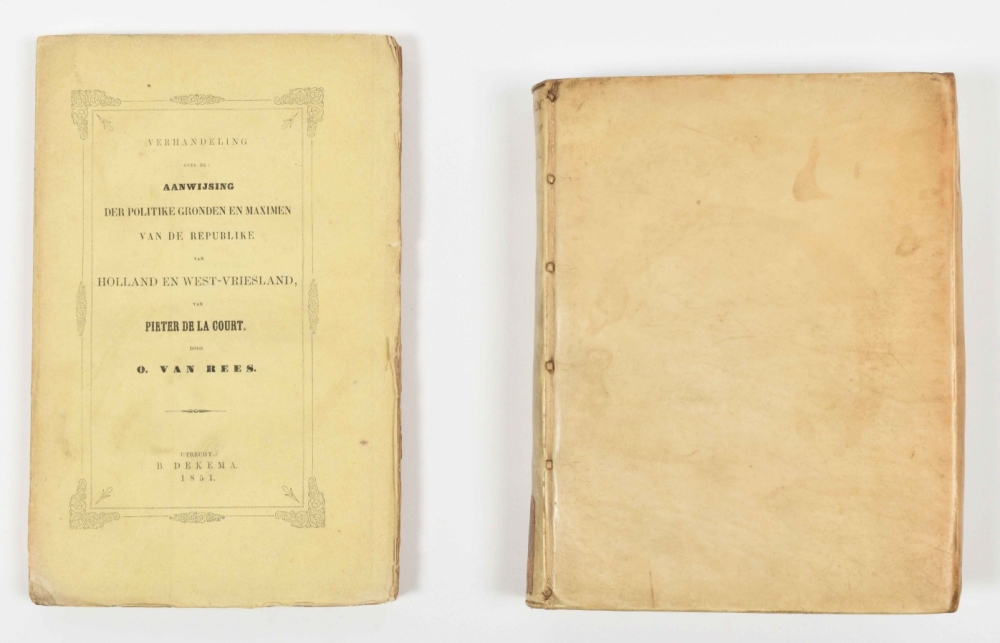 Very good copy, with contemp. annotation on title p.: "Voor den geregte der stadt Utrecht" (possibly by Pieter de la Court himself) and a small stamp "Archief Utrecht" in lower blank margin of the title p. ("duplicaat" stamp on inside front cover). Also with printed library ticket "Bibliotheek der stad Utrecht" at foot of spine. Wildenberg 1111. First edition of the revised and considerably enlarged version of the Interest van Holland (1662). On 28 May 1669 the privilege granted earlier was withdrawn and the book was forbidden by the synod of South Holland because its contents were "offensive and injurious for the Ministers of the Gospel". Added: Verhandeling over de: Aanwijsing der Politike gronden en Maximen (...) van Pieter de la Court (...) door O. van Rees (Utrecht, B. Dekema, 1851, contemp. wr., 4to. Thesis). (total 2)