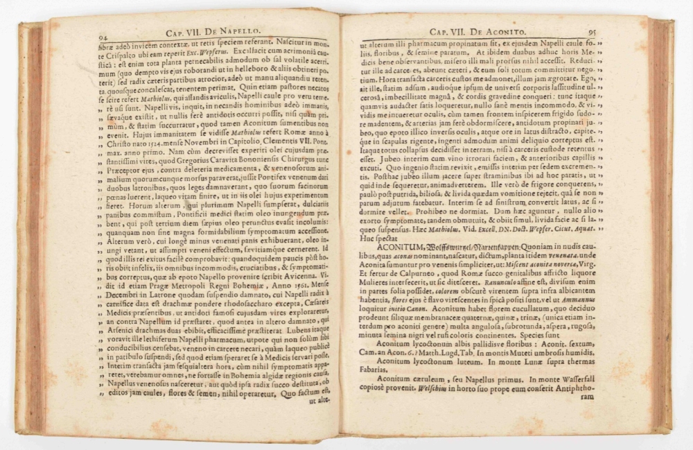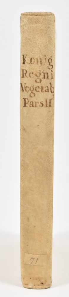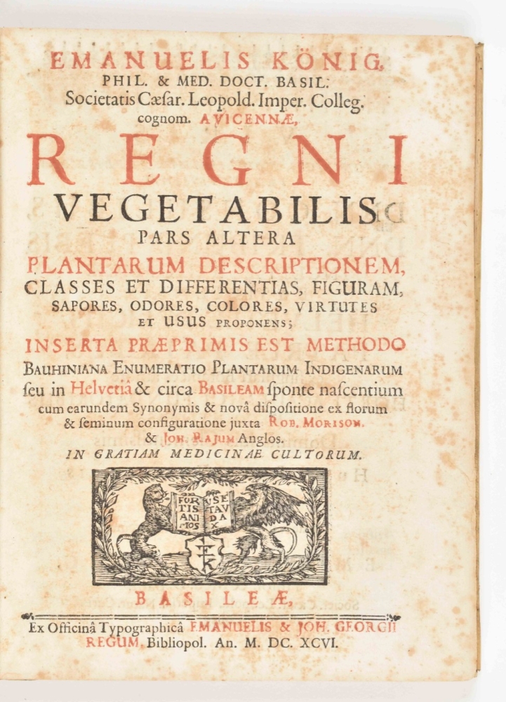 figuram, sapores, odores, colores, virtutes et usus proponens (...). Emanuel König. Basel, E. & J. Regum, 1696. Blind vellum w. title in ink on spine, 4to, xvi, 271,ix pp. Title page printed in red and black, engr. title vignetet. Bookplate of cardinal Mario Marefoschi (1714-1780) pasted on inner front board + library number in ink.