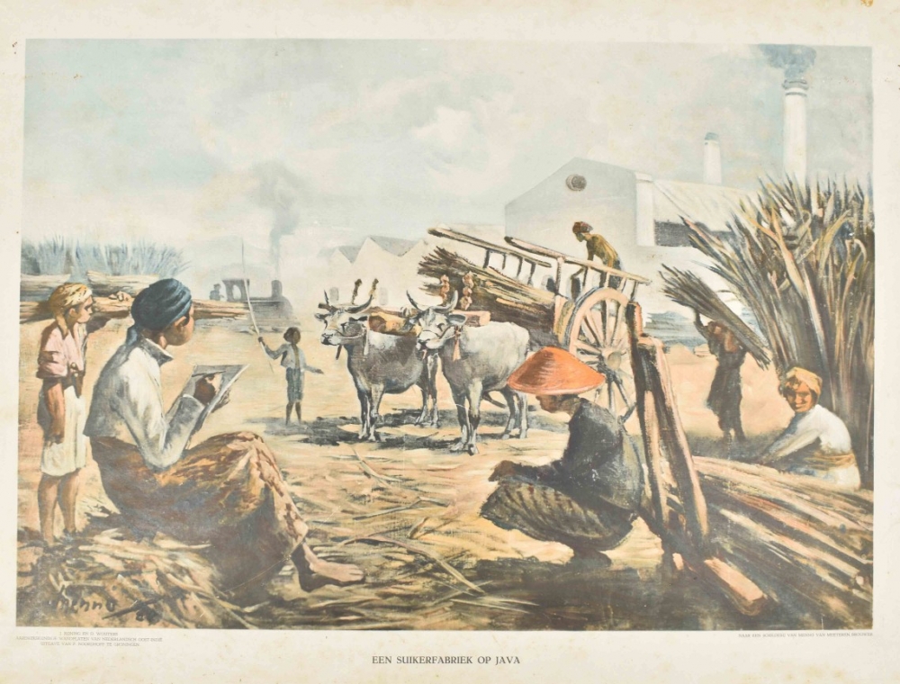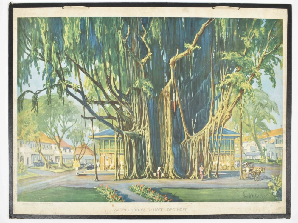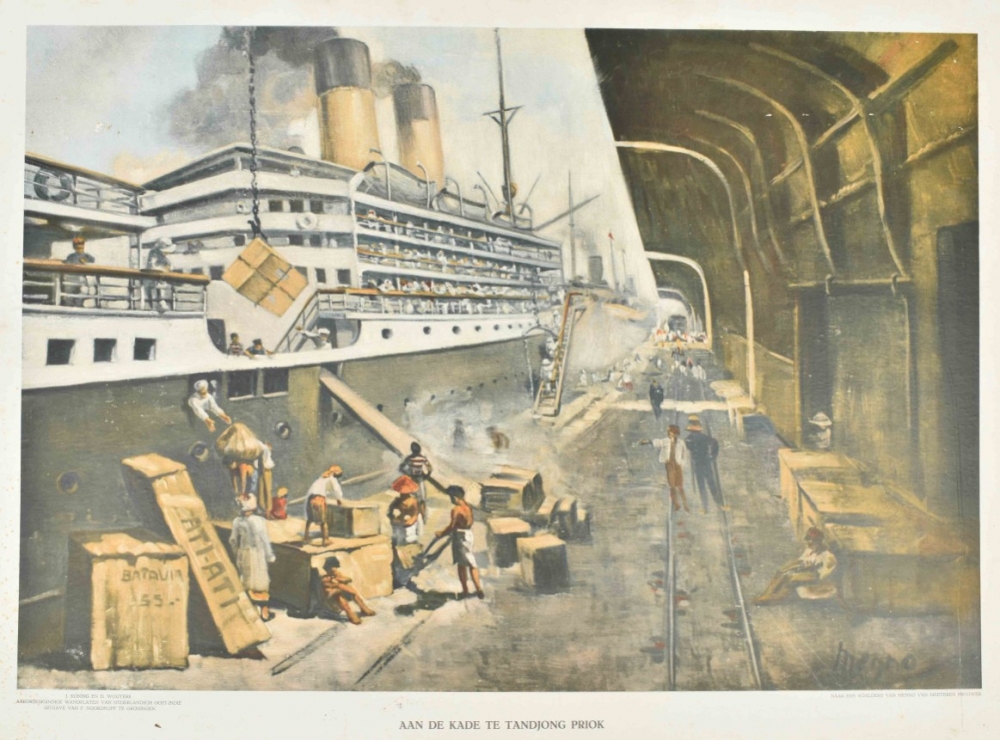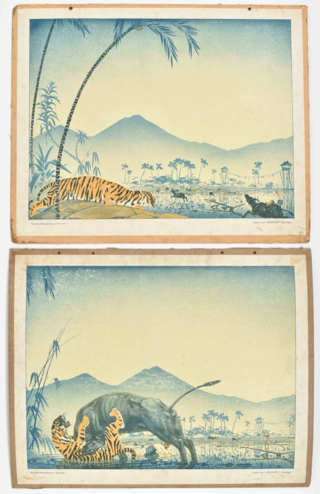 J. Koning & D. Wouters. Groningen, P. Noordhoff, c. 1925-1935. 86 x 117 cm. Includig 'Opening der volksraad van Nederlandsch Indië', 'Inlandsche landbouwer' (3x) and 10 others, of which 5 doublettes + 'Insulinde in woord en beeld'. Henri Zondervan. Groningen/ Batavia, J.B. Wolters, c. 1915-1930. c. 74 x 101 cm. Incl. Lijkverbranding op Bali', 'Tabaksbouw in Deli' (2x) and 2 others + 'Ons schoone Indië'. C.L.van Balen. The Hague, Daamen's Uitgeversmaatschappij, c. 1930. 83 x 113 cm. Incl. 'Waringinboom en Hotel des Indes' and 'Karok-Batakdorp' + 'Het vrije stelonderwijs'. Groningen, P. Noordhoff, 1914. 'Tijger en karbouw', plate a and b. 75 x 60 cm.