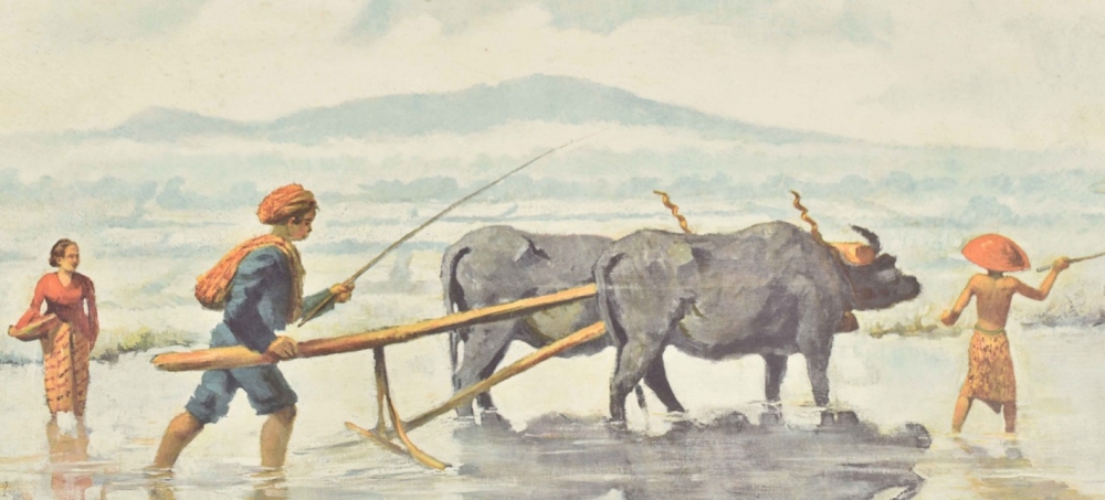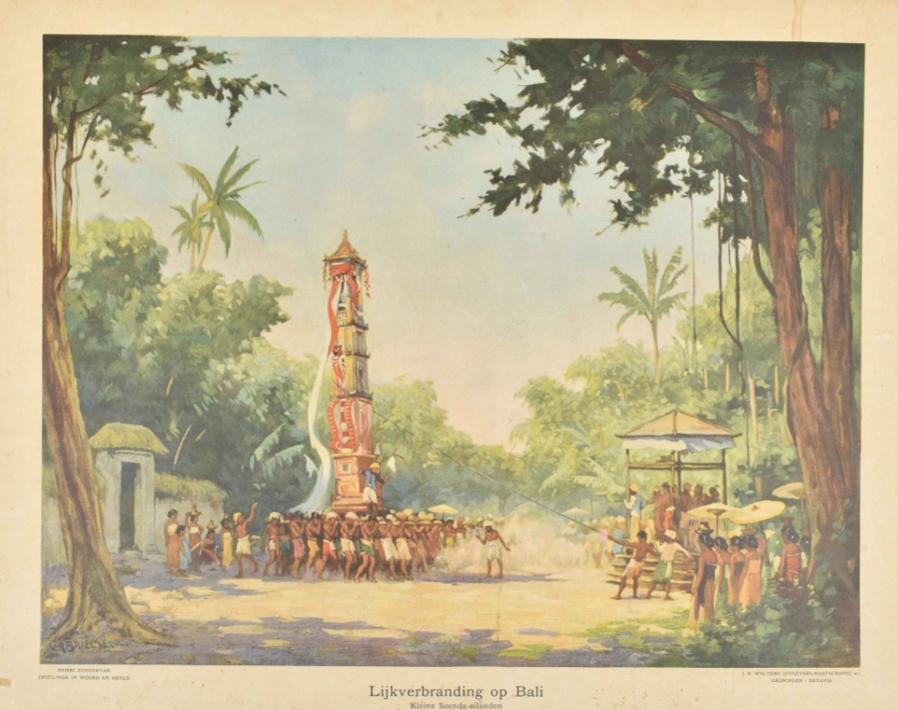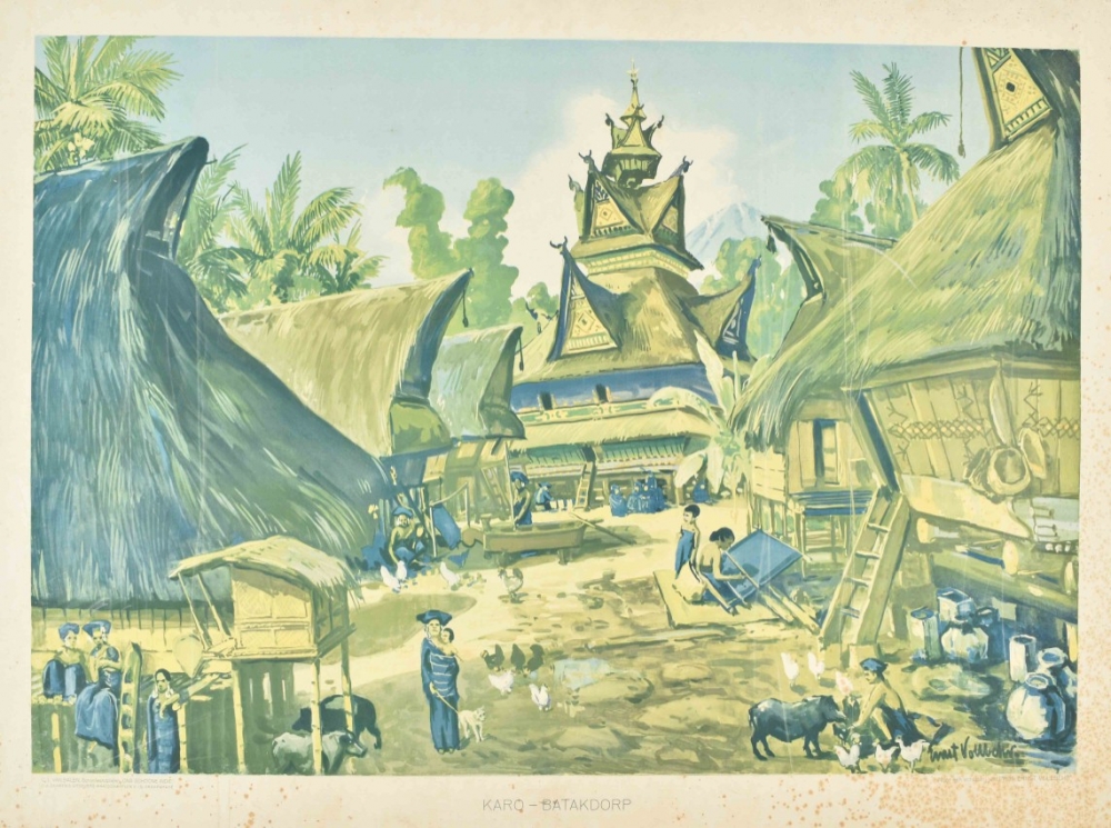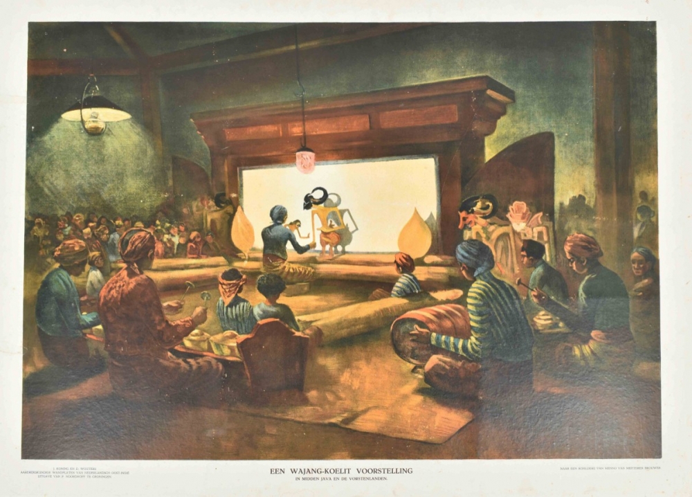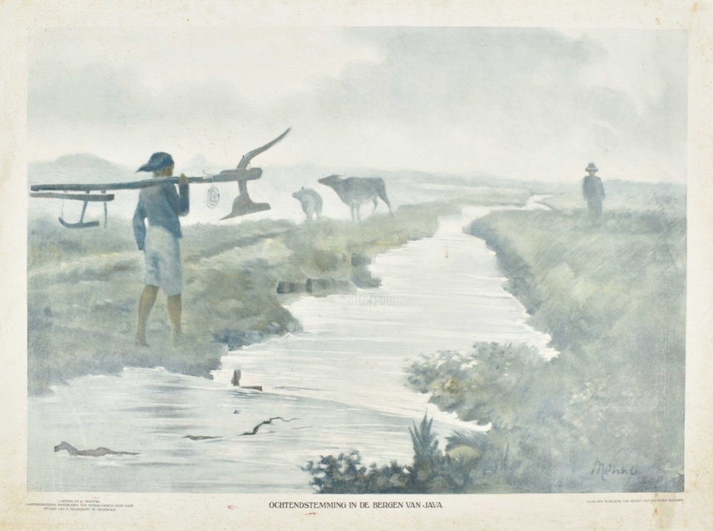 J. Koning & D. Wouters. Groningen, P. Noordhoff, c. 1925-1935. 86 x 117 cm. Includig 'Opening der volksraad van Nederlandsch Indië', 'Inlandsche landbouwer' (3x) and 10 others, of which 5 doublettes + 'Insulinde in woord en beeld'. Henri Zondervan. Groningen/ Batavia, J.B. Wolters, c. 1915-1930. c. 74 x 101 cm. Incl. Lijkverbranding op Bali', 'Tabaksbouw in Deli' (2x) and 2 others + 'Ons schoone Indië'. C.L.van Balen. The Hague, Daamen's Uitgeversmaatschappij, c. 1930. 83 x 113 cm. Incl. 'Waringinboom en Hotel des Indes' and 'Karok-Batakdorp' + 'Het vrije stelonderwijs'. Groningen, P. Noordhoff, 1914. 'Tijger en karbouw', plate a and b. 75 x 60 cm.