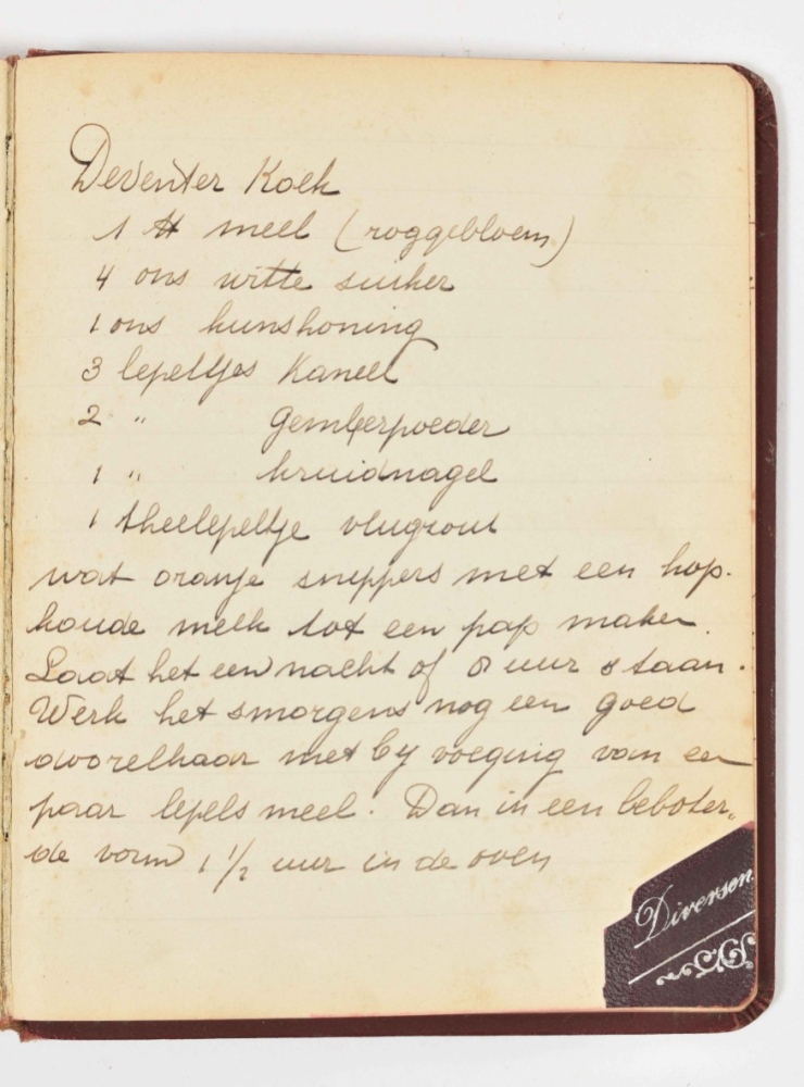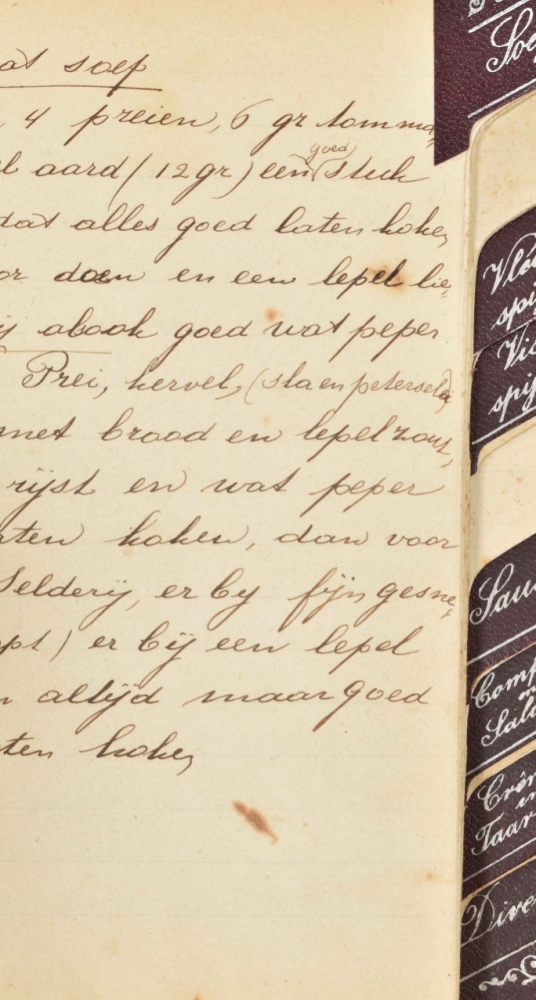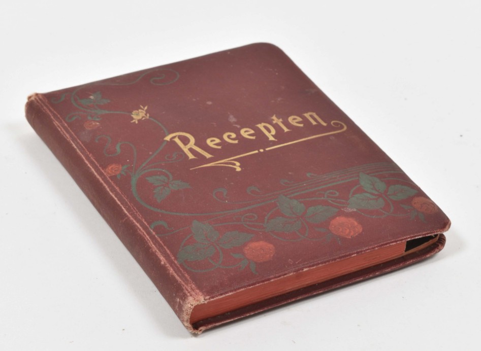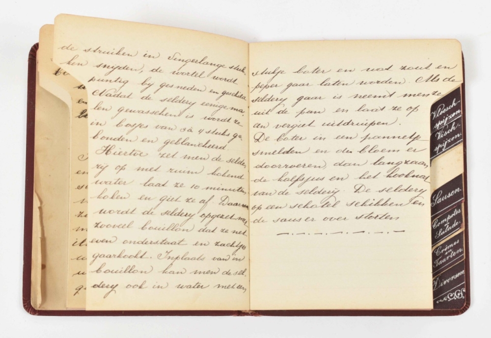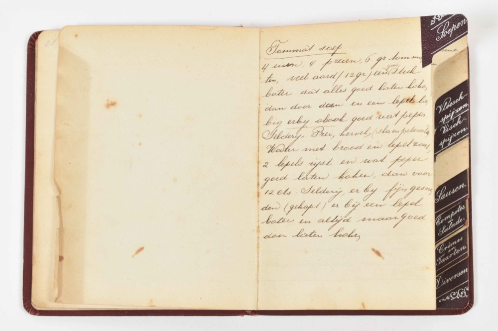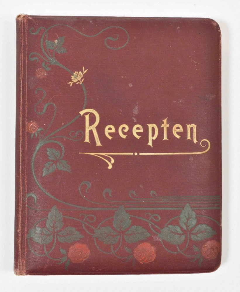 Circa 1910-1920. 55 pp. filled with recipes, marked with index tabs in silver-tooled leather in right-hand margin divided into 9 categories: soups, meats, fish, sauces, compotes and salads, creams and pies and various. Contains recipes such as "Zwererik croquetjes", "Deventer koek", "Boterhammenschoteltje" and "Indische spekkoek". Red cloth album with gilt title "Recepten", decorative border with roses in red and green.