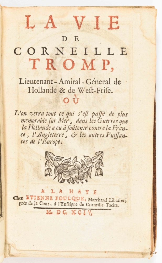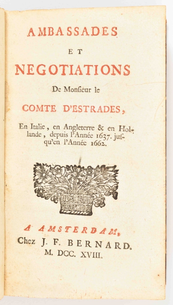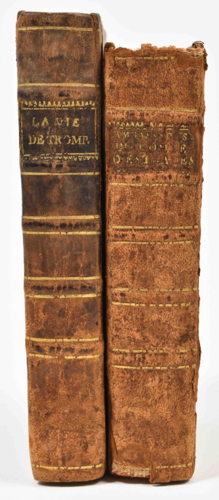 Lieutenant-Amiral-General de Hollande & de West-Frise. The Hague, Etienne Foulque, 1694. (14), 550 pp. Engr. portrait of Tromp. Half calf, raised gilt spine, gilt title label, 8vo. Binding sl. soiled, first few pp. with mild stain in upper r. corner + Ambassades et negotiations de monsieur le comte d'Estrades, en Italie, en Angleterre & en Hollande, depuis l'Année 1637 jusgu'en l'Année 1662. Comte Godefroi Louis d' Estrades. Amsterdam, J.F. Bernard, 1718. (12), 545, (10) pp. Half calf, raised gilt spine, gilt title label, red sprinkled edges. 8vo. Binding with some wear, spine ends dam.