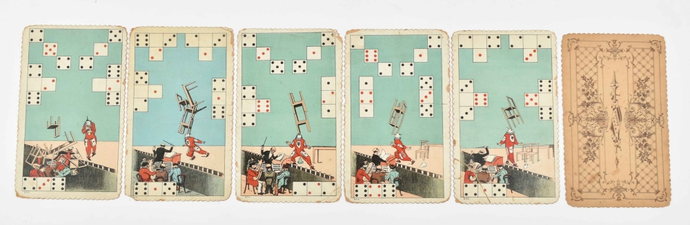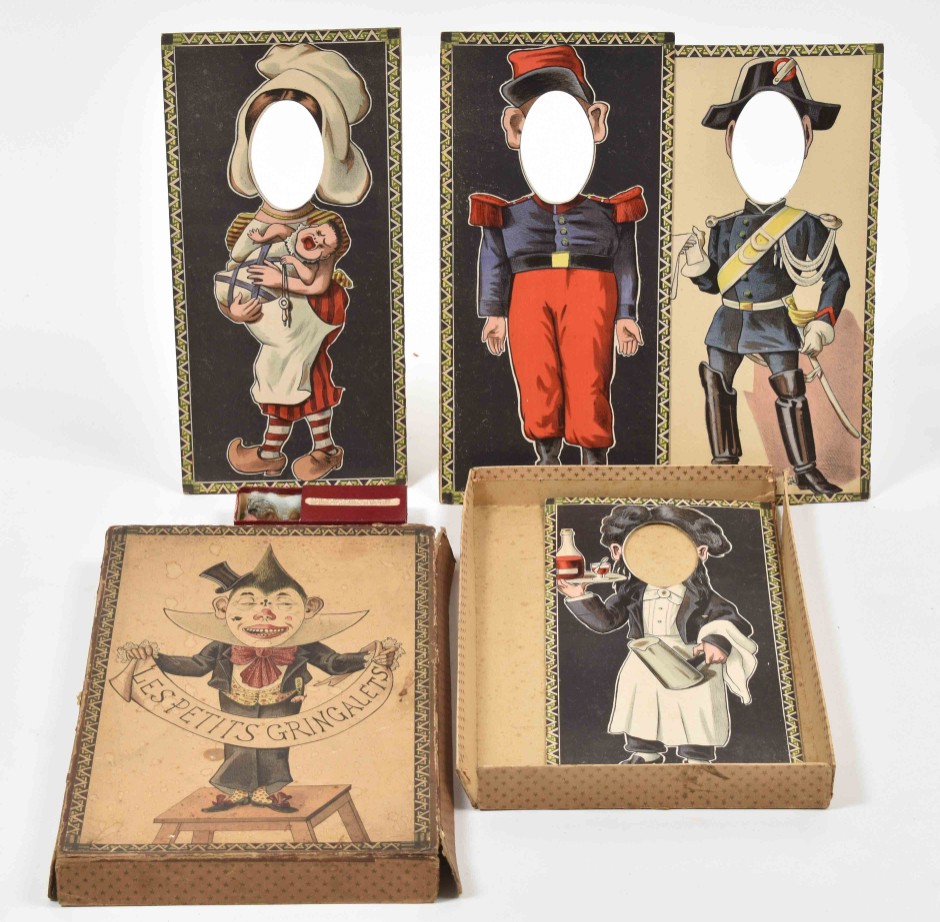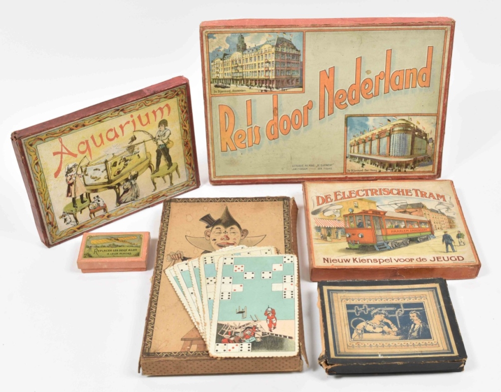 Added: 'Clown balancing chairs on his head.' Memory game. Spears, circa 1900. 6 lithographed cards of 11 x 19 cm. + Les Petits Gringalets. Lithographed box (32 x 19 x 3 cm) with 4 lithographed cardboard figures and with box with objects to make the faces of these figures 'come to life' using your fingers. Box dam. + De Elektrische Tram: Nieuw Kienspel voor de Jeugd. Dutch, early 20th cent. -and 2 others (total 7)