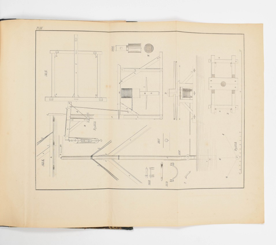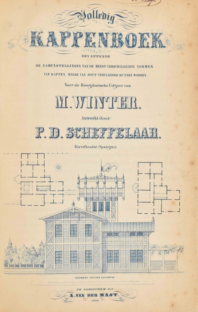 See the Dutch description: bevattende de zamenstellingen van de meest verschillende vormen van kappen welke van hout vervaardigd kunnen worden. M. Winter. Bewerkt door P.D. Scheffelaar. Gorinchem. A. van der Mast. 1856. Small folio, half-cloth. Blue engraved title with vignette, 46,(2) pp. and complete with 56 folding plates (steel engravings). Name on title in hs.