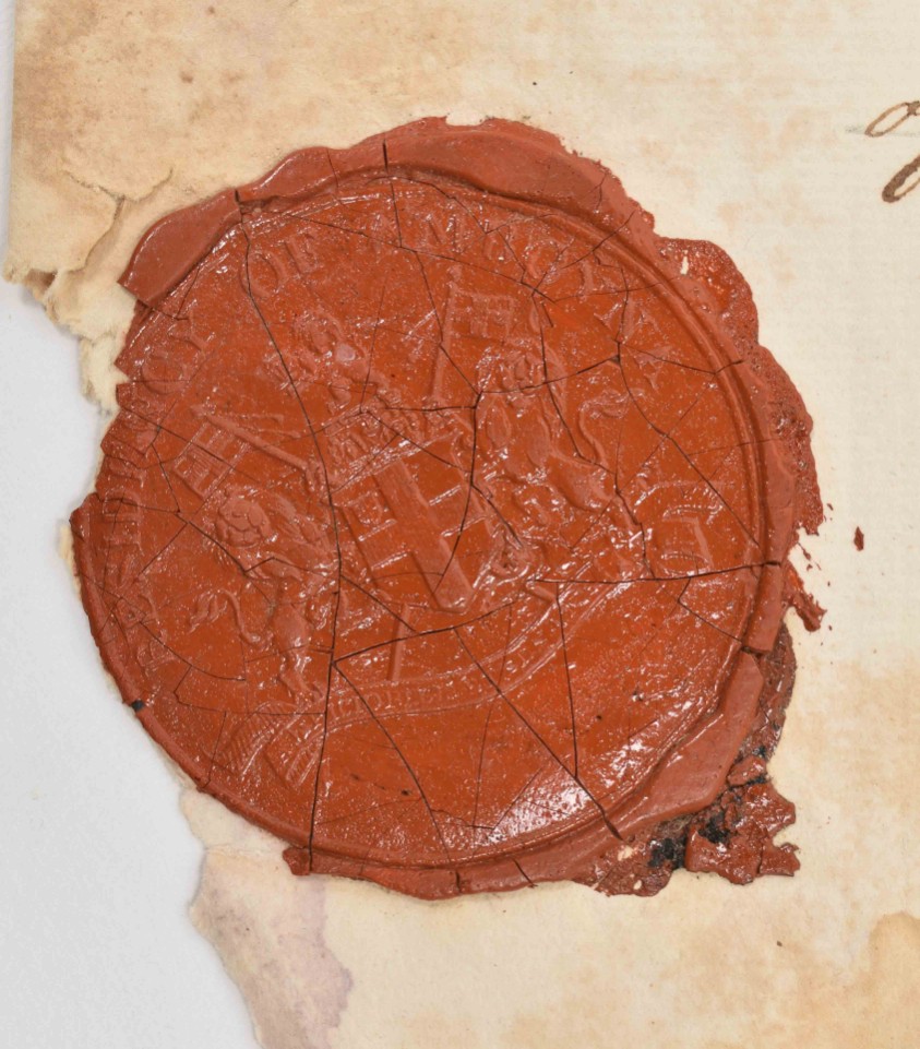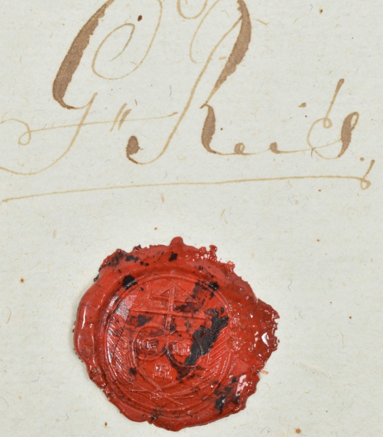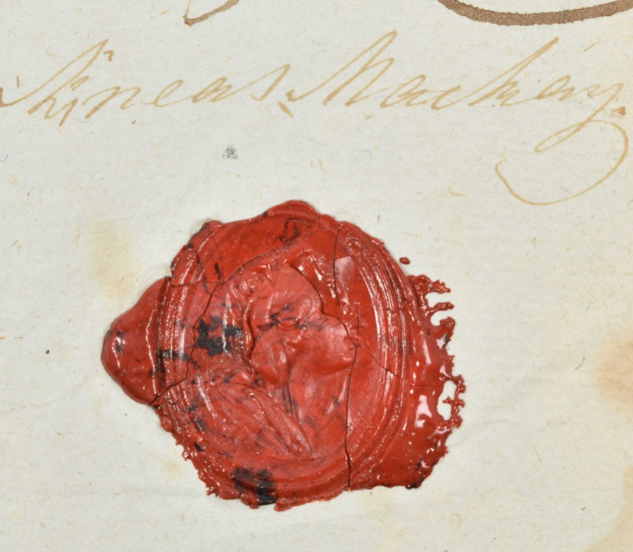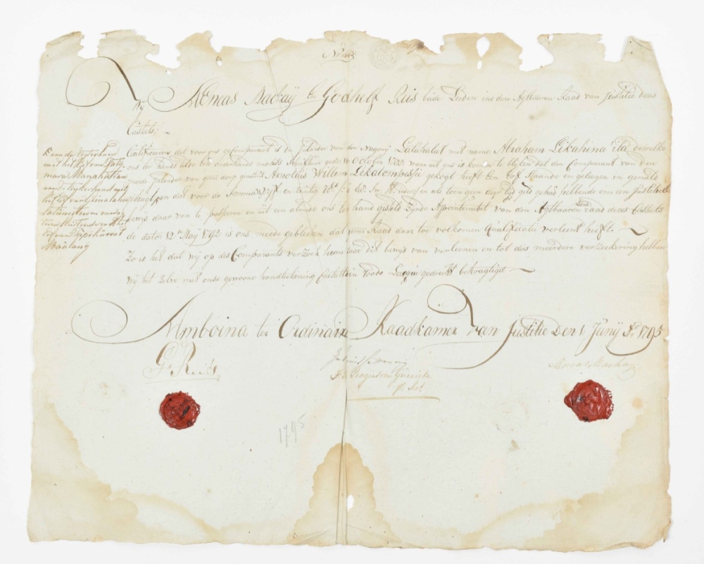 bought by the "Inlander van den negozij Latuhalat met name Abraham Likahina 'ila" from "den meede inlander van gem. dorp genaamt Arnoldus Willem Lekalompessie" on 1 October 1788, manuscript on a plano sheet, 32.5 x 40 cm, issued, signed and sealed with red wax seals by Aeneas Mackay and Godhelp Reis "beide leeden inc (?) den agtbaaren Raad van Justiitie dezes Cateels", also signed by the secretary Frederik Willem Progers van Guericke, dated "Amboina ter Ordinaire Raadkamer van Justitie den 1 Junij Ao. 1795", with the certified VOC tax blindstamp at the top