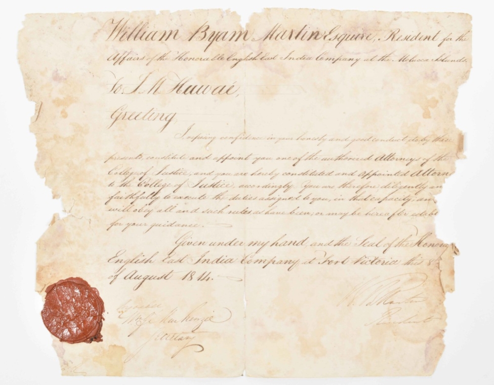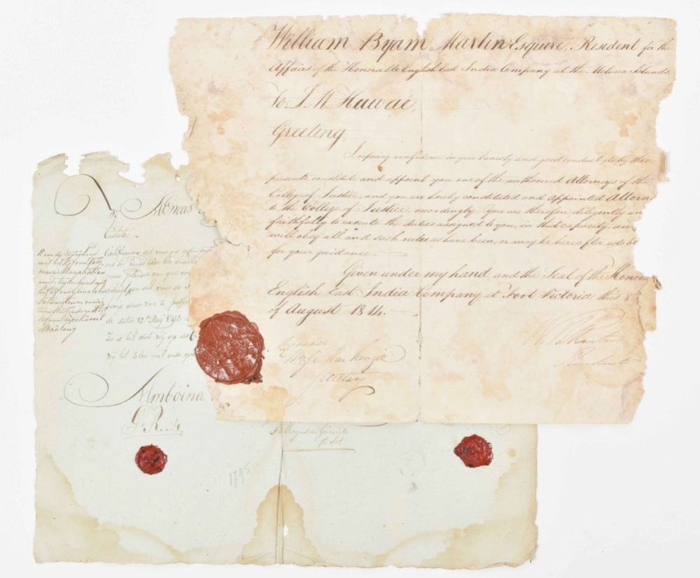 Upper margin lacks some portions (probably nibbled by tropical insects), affecting the signature of the person certifying the tax stamp; folds and waterst. Highly interesting deed of transport, because of the fact that both buyer and seller were indigenous to Ambon. The buyer indicated to Mackay and Reis that all that time (between 1788 and 1795) he had not had the money to pay for a deed legally documenting his purchase. The piece of land itself had cost him "vijf en twintig rds 48 sw." Apparently, the original indication of the location of the land ("gelegen in gemeld gehugt"), was considered insufficient, so a very precise addition was made in the left-hand margin: "Aan de regterhand met het erf van Patijmara Manahûti'an, aan de linkerhand met het erf van Gimalaha Latûmieten en van agteren sluitende met het het erf van Hopihûwad Maûlanij." Only one year after this deed was issued, the British took over Ambon. Added: (2) Similar notarial document in poor condition, issued by the English East India Company at Fort Victoria on 8 August 1814. Just five days later, on 13 August, Ambon was restored to the Dutch by virtue of the Anglo-Dutch Treaty of that year. (total 2)