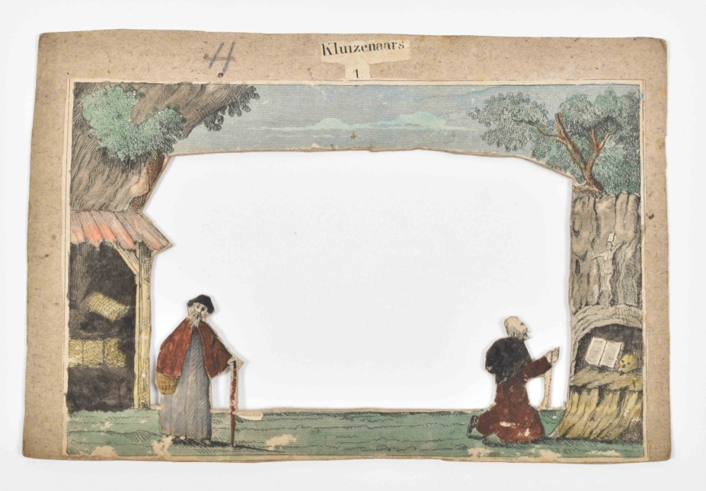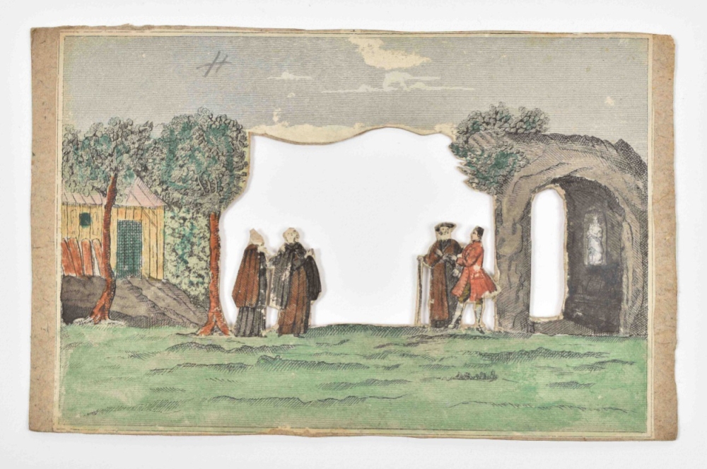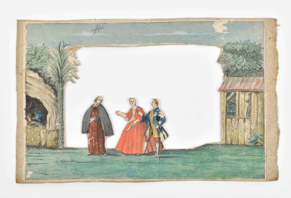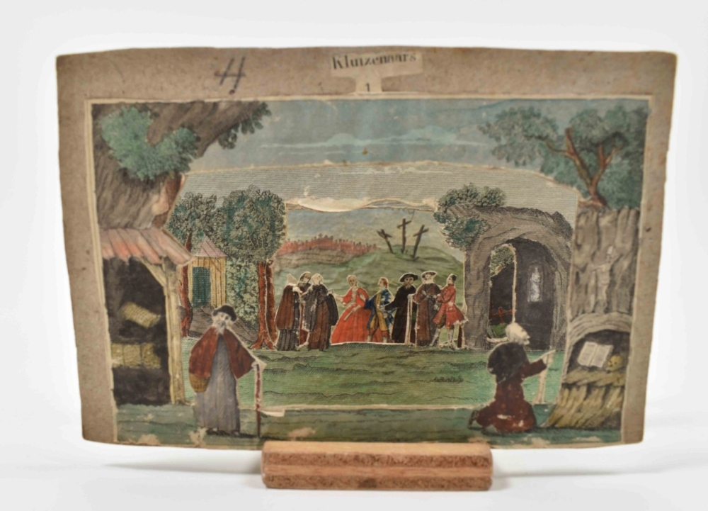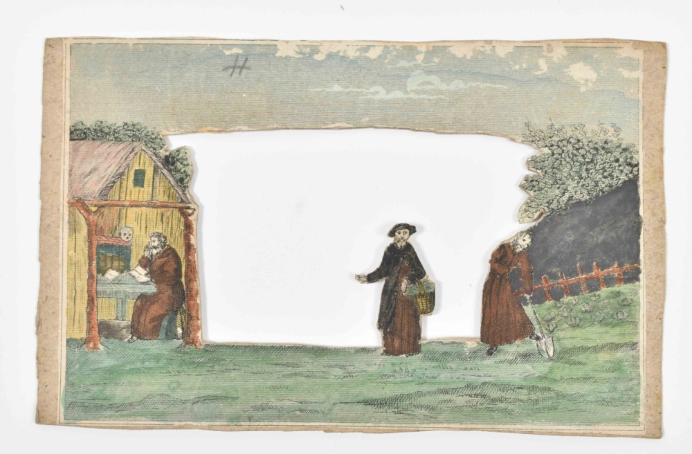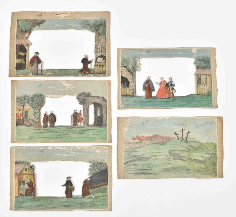 Perspective scene, table-top tableaux. Set comprising 5 contemporary hand coloured lith. scenes. Dutch or German (possibly Schulz, Mainz). After Martin Engelbrecht, c. 1830-1850. 10 x 15 cm. Paper partly worn.