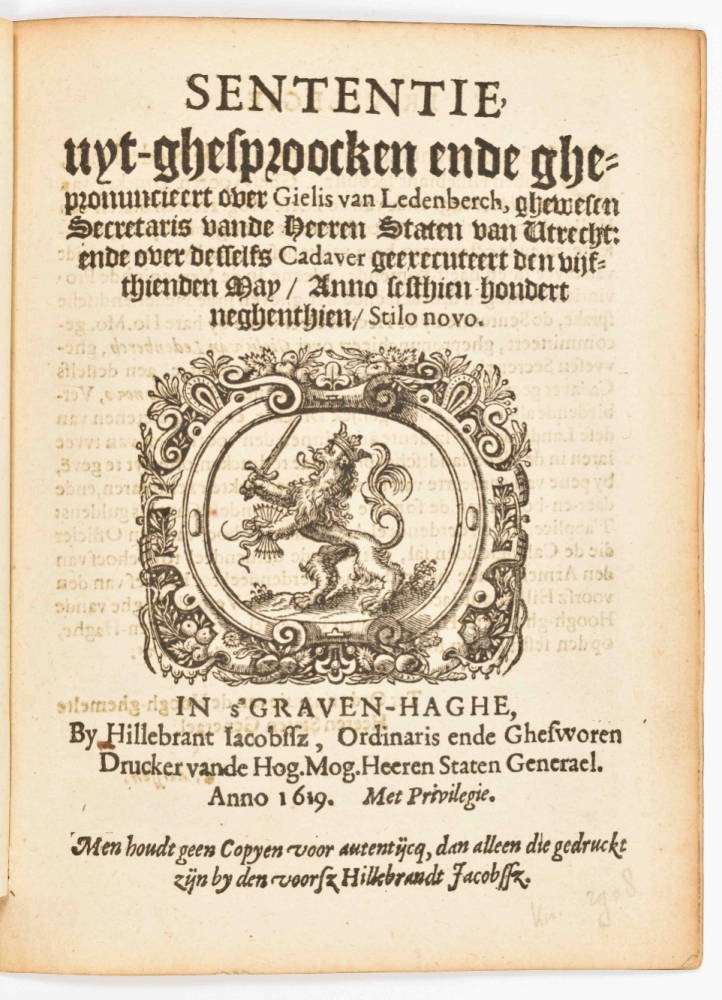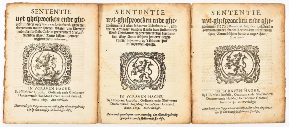 Johan van Oldenbarnevelt, Gillis van Ledenberg, Hugo Grotius and Rombout Hogerbeets, all published in The Hague by Hillebrant Iacobssz., 1619, all with the Dutch lion as woodcut title vignette, all signed H. Potz at the end in print, all sm. 4to.
