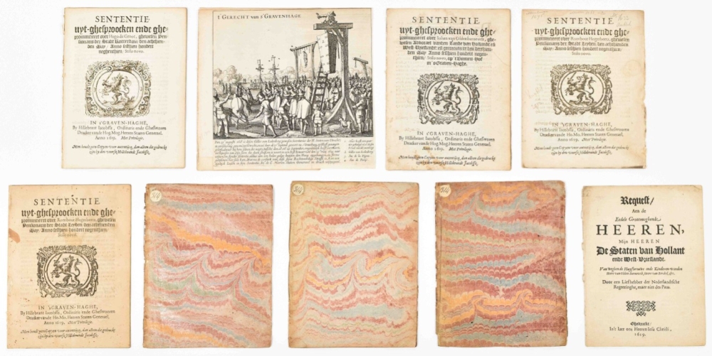 The struggle for power between the regent party of Holland and Oldenbarnevelt on the one side, and the stadtholder Maurice and his supporters on the other side, was decided on 28 August 1618, when Maurice had Oldenbarnevelt, Grotius and a few others put under arrest. Oldenbarnevelt was sentenced to death, Hogerbeets and Grotius were sentenced to life and imprisoned at Loevesteijn. Gilles van Ledenberg (secretary of Utrecht and follower of Johan van Oldenbarnevelt) was imprisoned in 1618 and committed suicide. He was still officially "punished" posthumously: his coffin was hung at the gallows on 15 May 1619. The indication "stilo novo" concerning the dates refers to the new Julian calendar, as opposed to "stilo veteri", referring to the old, less precise Gregorian calendar. (1) Sententie, uyt-ghesproocken ende ghepronuncieert over Gielis van Ledenbergh, ghewesen secretaris van de Heeren Staten van Utrecht: ende over desselfs cadaver geexecuteert den vijfthienden May, anno sesthien-hondert neghenthien, stilo novo. (12) p., without binding. Knuttel 2908. This copy with EXTRA very fine fold. engr. plate depicting this curious punishment, published by Claes Janszoon Visscher (cf. Knuttel 2914, Muller, Historieplaten 1400); (2) Sententie, uyt-ghesproocken ende gepronuncieert over Iohan van Oldenbarnevelt (...) en geexecuteert den derthienden May anno sesthien-hondert negenthien, stilo novo, op 't Binnen-hof in 's Graven-Haghe. (16) p., old threadbound wr., (waterst.). Knuttel 2884 (variant). Bound with the related pamphlet Knuttel 2925; (3) Sententie, uyt-ghesproocken ende ghepronuncieert over Hugo de Groot (...) den achthienden May, anno sesthien-hondert neghenthien. Stilo novo. (17),(3 blank) p., without binding. Knuttel 2920; (4) Sententie, uyt-ghesproocken ende ghepronuncieert over Rombout Hogerbeets (...). den achthienden May, anno sesthien-hondert neghenthien. Stilo novo. (12) p., old threadbound wr., (waterst., sl. foxed). Knuttel 2915. Added: 4 duplicates (incl. variants) of the punishments of Hoogerbeets (2), Oldenbarnevelt and Van Ledenberg. And added: Request (...) van weghen de huysvrouwe ende kinderen vanden heere van Olden-Barnevelt (1619). (total 9)
