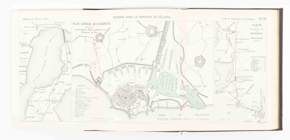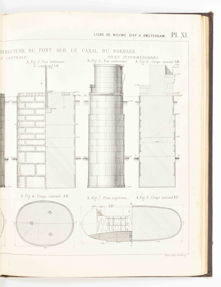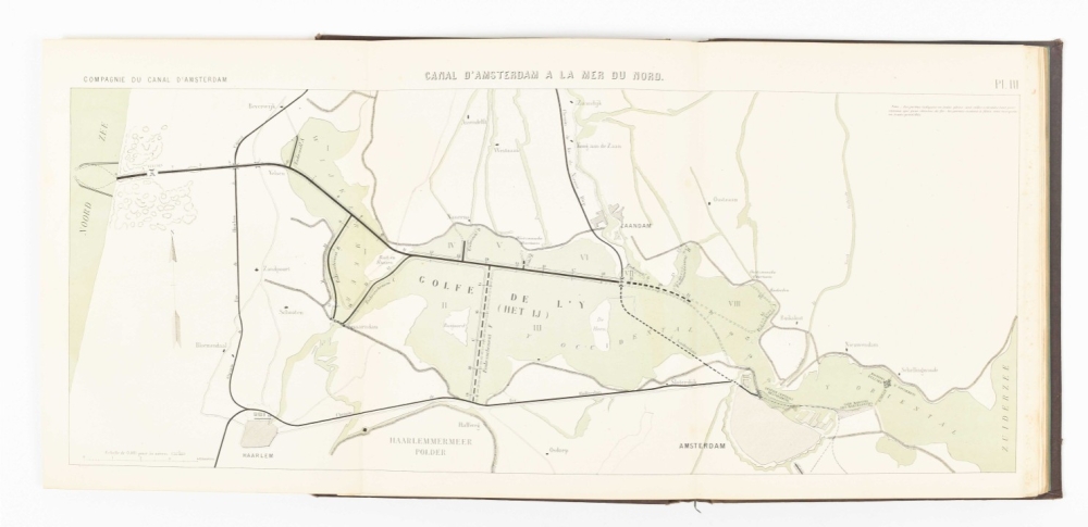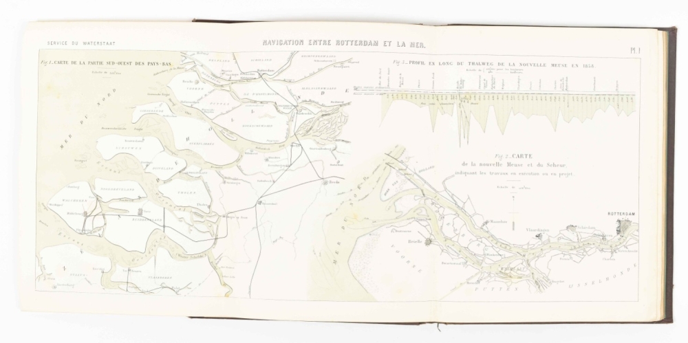 Large folding plates with locks, bridges and other examples of hydraulic engineering related to the navigation of Amsterdam and Rotterdam up to the North Sea as well as several inland examples. Text with occ. sm. brown stains, engravings complete and good.