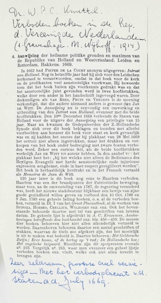 Several endpapers renewed, a photocopy of the reference in Knuttel, "Verboden boeken in de Republiek", 1914, bound at the front, first few pp. with mild waterst. in lower right corner.