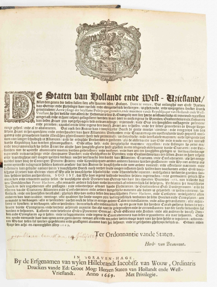 Bound with the rare pamphlet by the States of Holland forbidding the production or sale of this work in 1669. In December of 1668, the States of Holland granted a privilege for the book for 15 years. This was revoked again in May 1669, after the Synod of South Holland objected to the work, saying it was a threat to state and church.