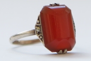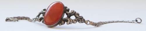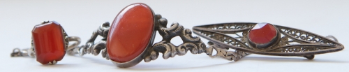 This item contains no English description. See the Dutch description: Armband (17 cm.), ring en broche. Zilver, alle met carneool. Ca. 1920.