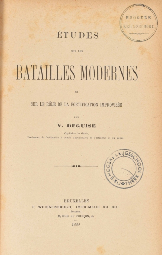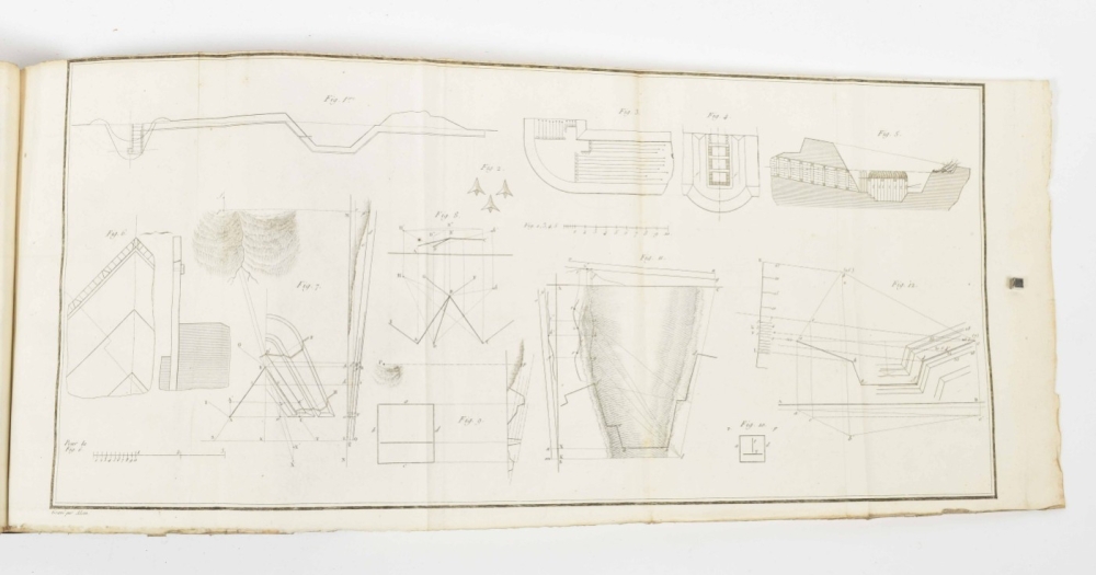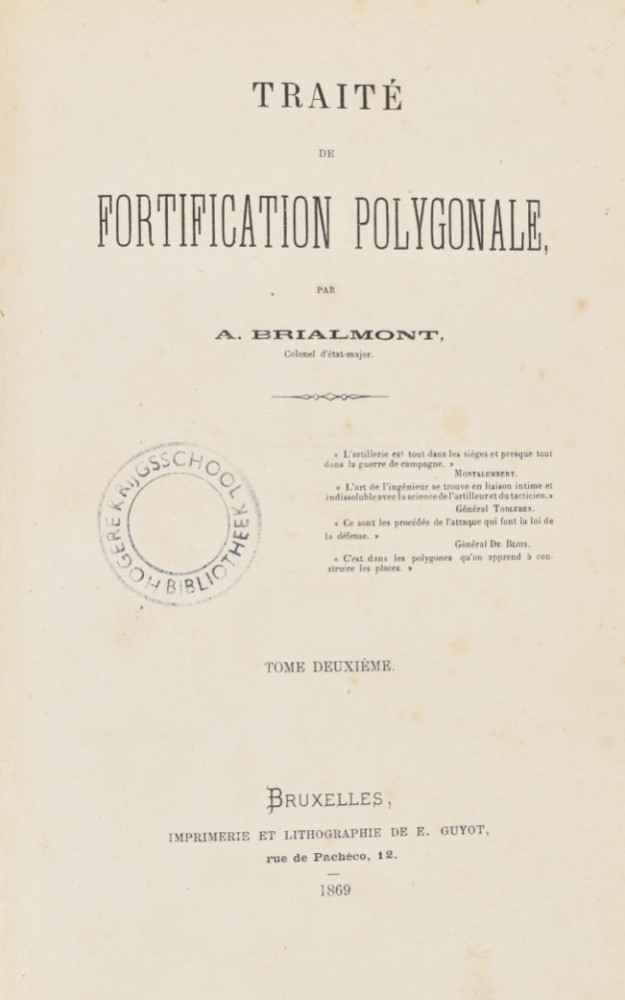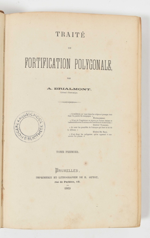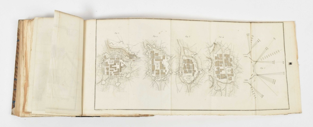 Paris, Magimel, Anselin et Pochard, 1812. 3 vols in 1. With 20 (of 21) fold. plates. Half calf. 8vo. Upper spine dam. 2) A. Brialmont. Traite de fortification polygonale. Bruxelles, Guyot, 1869. 1 fold-out plate. Half calf. Large 8vo. Worn. 3) V. Deguise. Études sur les batailles modernes. Bruxelles, P. Weissenbruch, 1889. 5 fold-out plates. Half cloth. Large 8vo. Worn, def. to spine. 4) Le Chevalier de Birago. Examen du nouveau système de ponts de chevalets (...) Paris, J. Corréard, 1847. 2 fold-out plates. Half leather. 8vo.