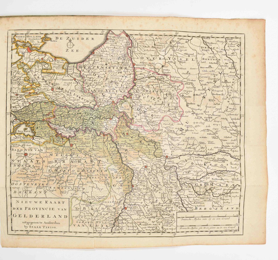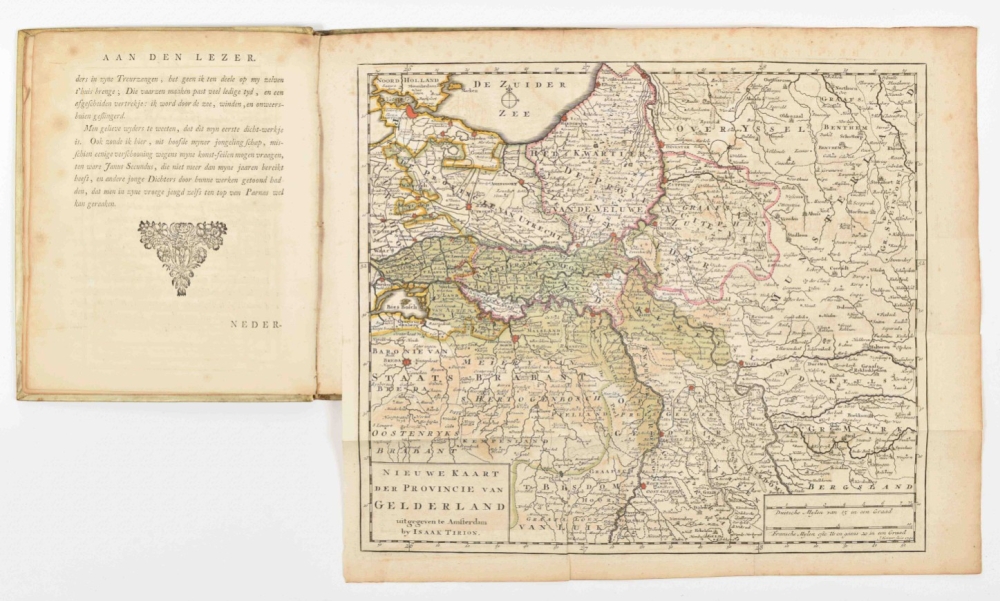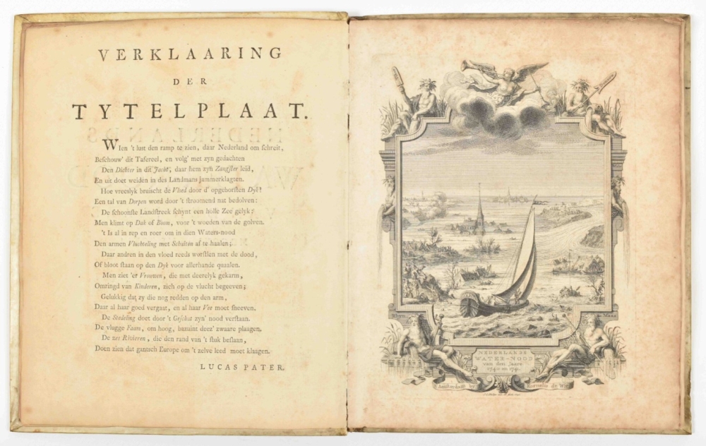 van den jaare MDCCXL en MDCCXLI. P. Bakker. Amsterdam, Kornelis de Wit, 1741. 4to, vellum, blindstamped boards. Title with sm. vignette. Frontispiece with flooded area engraved by J.C. Philips facing explanatory poem by Lucas Pater. (10),50,(1) pp. with handcoloured folding map of Gelderland by I. Tirion. Bound together with: Tafereel des Zondvloeds, ter gelegenheit der tegenwoordige watervloeden, den Nederlanderen toegewyd. Frans de Haes. Rotterdam, Philippus Losel, 1741. (12) pp.
