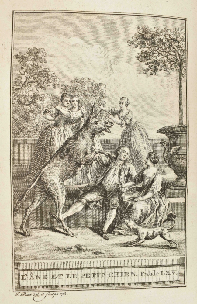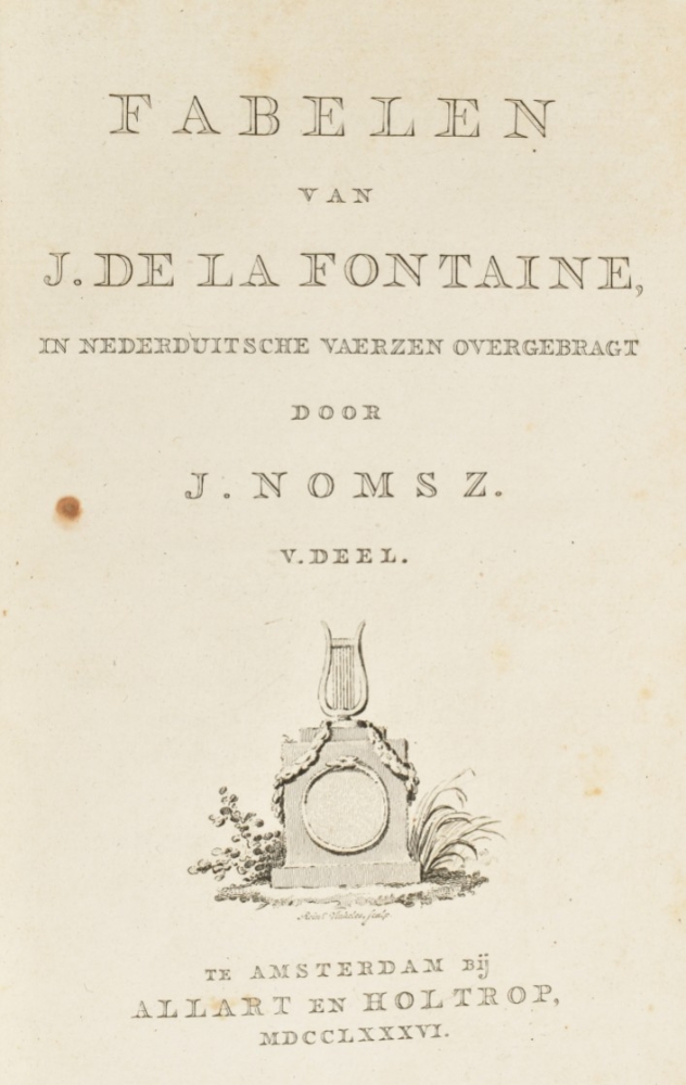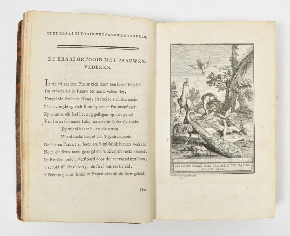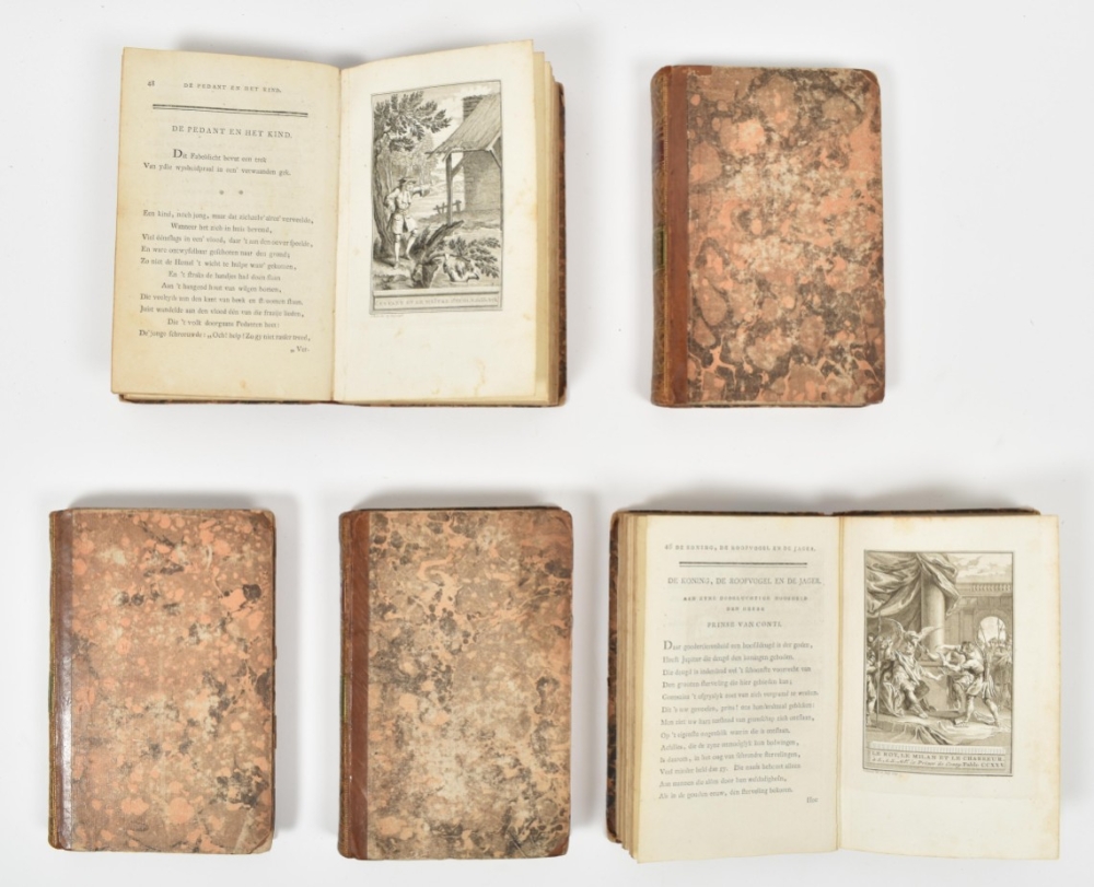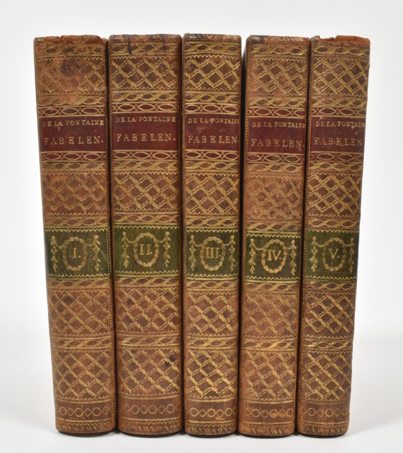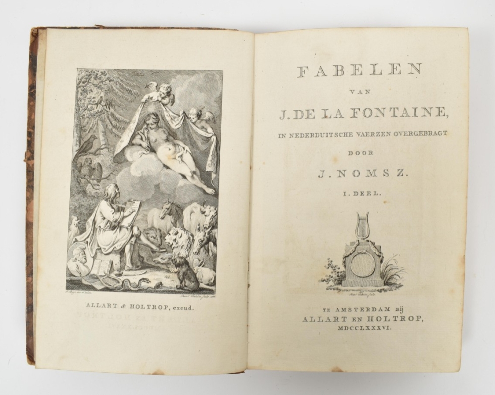 in Nederduitsche vaerzen overgebracht door J. Nomsz. J. de la Fontaine. Amsterdam, Allart en Holtrop, 1786. 5 vols. Engraved frontispiece, 275 full-page engravings. Uniform half calf, profusely gilt spines with red and green morocco letterp. and vol. labels, 8vo.