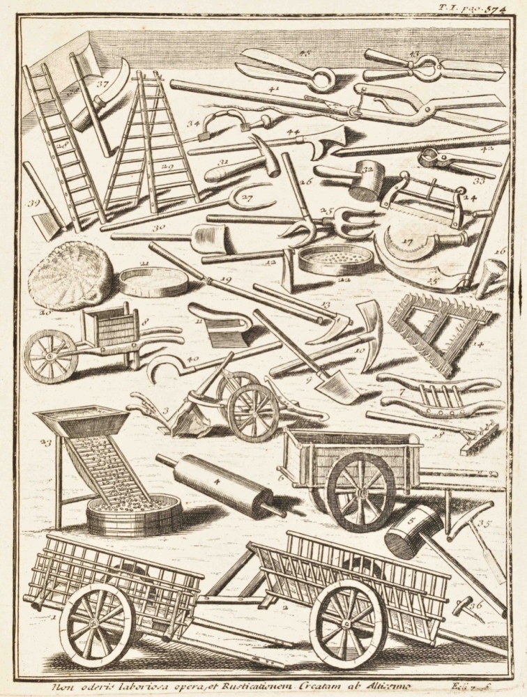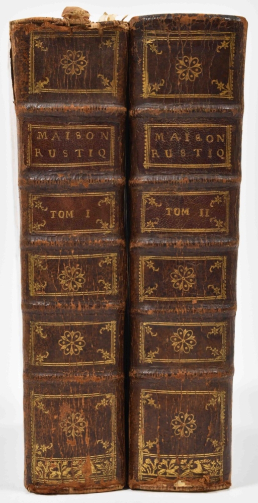 One plate opposite p. 293 in the second vol. apparently only present with the right-hand illustration (perhaps on purpose for this edition); most plates loosening. Vol. 1 lower joint splitting in top compartment; three spine ends and most outer corners showing. Acceptable copy. Rare edition, we could not verify if the number of plates is correct, but we did find a 4th edition with 23 plates. The work, covering all aspects of the countryside household at the time, was tremendously popular, going through many editions during the 18th century. The first edition appeared in 1700.