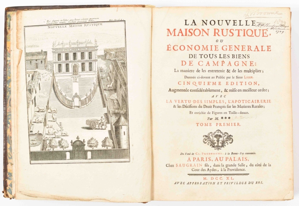 ou Économie generale de tous les biens de Campagne: la maniere de les entretenir & de les multiplier; donnée ci-devant au public par le Sieur Liger. Cinquème edition, augmentée (...) avec (...) l'apoticairerie (...). Enrichie de figures en taille-douce par M. *** (= Henri Besnier). Louis Liger. Paris, Saugrain Fils, 1740, 2 vols., (14),970; (6),999,(1) p., with engr. frontisp., 23 engr. plates (some fold., 1x with movable part) and woodcut ills. in the text, contemp. unif. calf, gilt and ribbed spine w. mor. letterpieces, 4to.