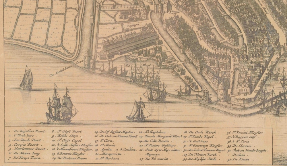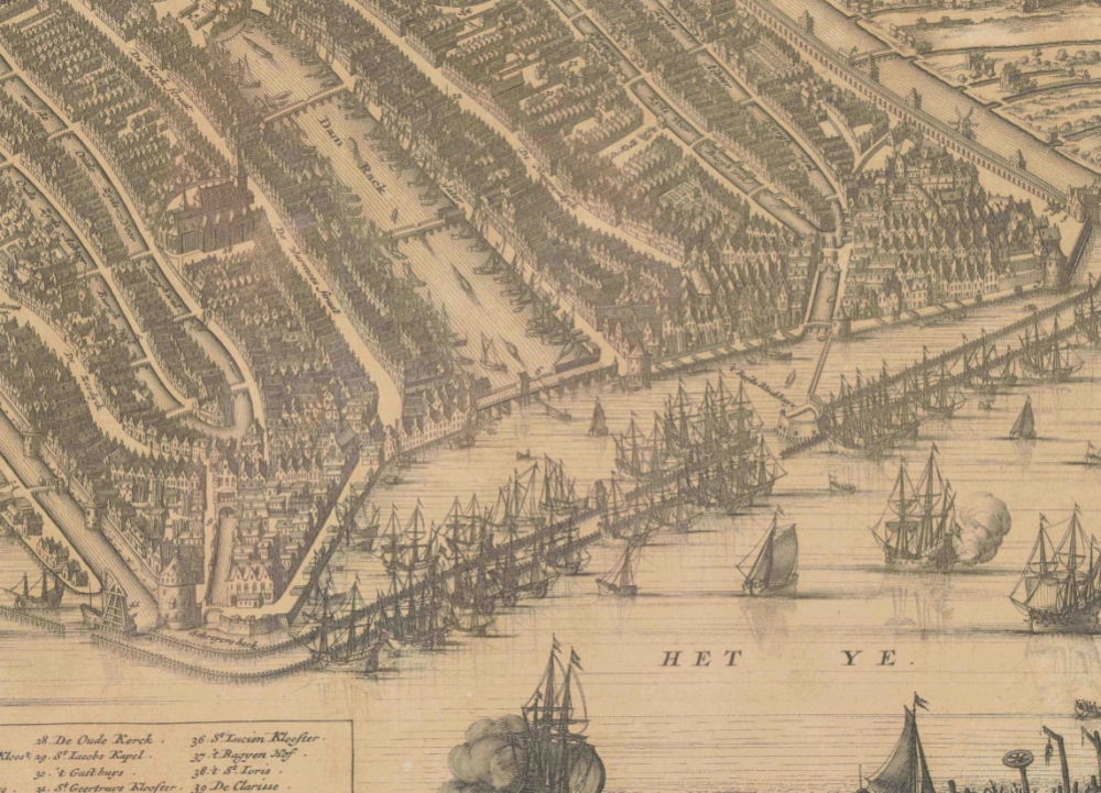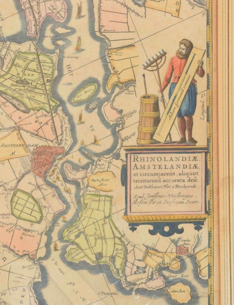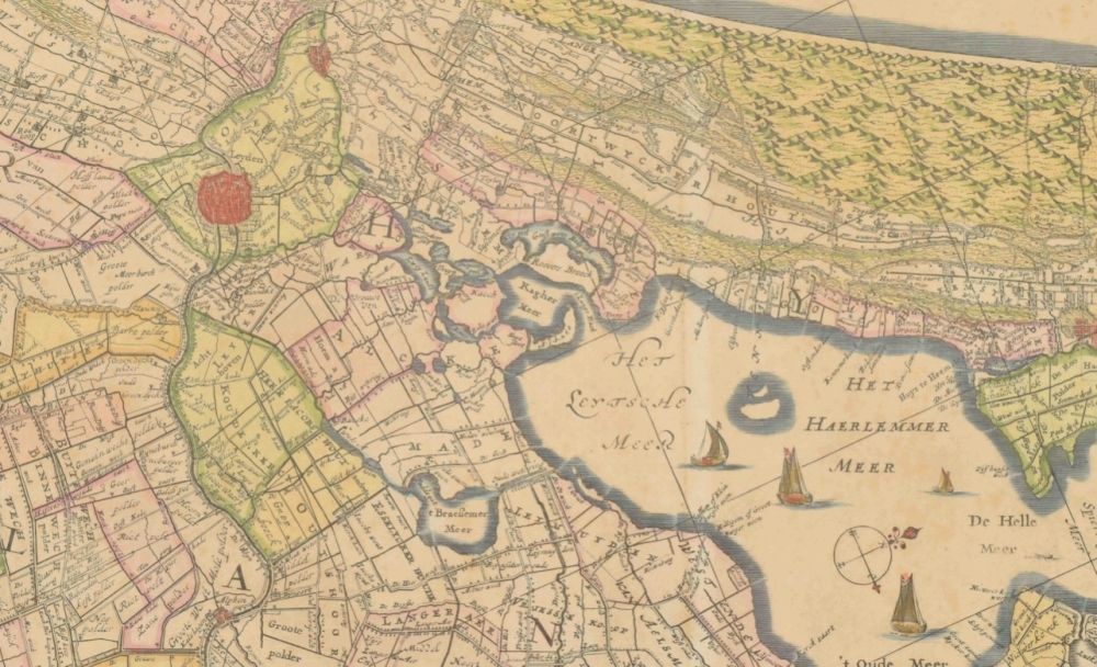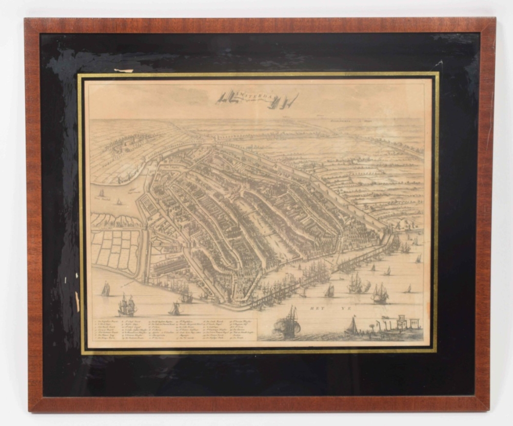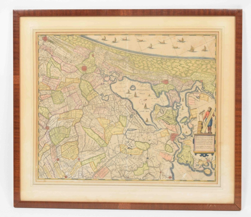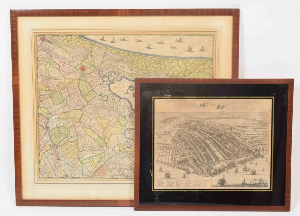 et circumjacent. aliquot territorioru, accurata desc. Janssonio Waesbergios, Moses Pitt and Stephanum Swart, c. 1660. Handcoloured. Depicting the Haarlemmermeer area, including the cities of Leiden, Beverwijk, Muiden and Gouda. Framed in passe-partout under glass, map 46 x 54.5 cm. Some mild foxing, repair in lower right corner + Amsterdam vertoonde zugh aldus inden Iare 1500. Middle fold as issued in Beschryvinge van Amsterdam by C. Commelin, c. 1695. Framed in passe-partout under glass, map 27.5 x 35.5 cm. Sl. browned.