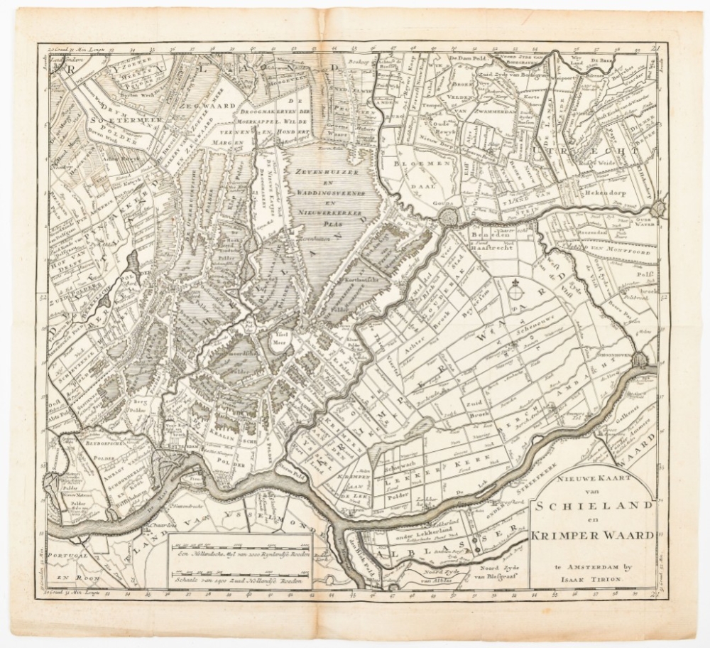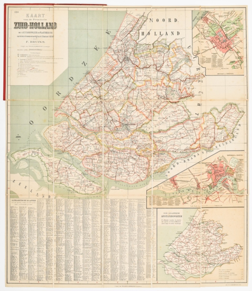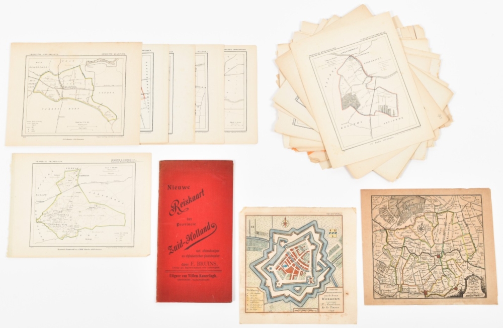 Jacob Kuyper. Leeuwarden, Hugo Suringar, 1870. All of Zuid-Holland or Utrecht. 20 x 27 cm. A few with sl. frayed margins + Nieuwe kaart van Schieland en Krimperwaard. Amsterdam, Isaak Tirion, c. 1740. Folded, 37.5 x 41 cm. 2 folds reinforced verso + Nieuwe reiskaart der provincie Zuid-Holland. F. Bruins. Groningen, Willem Kamerlingh, c. 1905. Colour lithograph. Heavy paper on cloth - and 6 more.