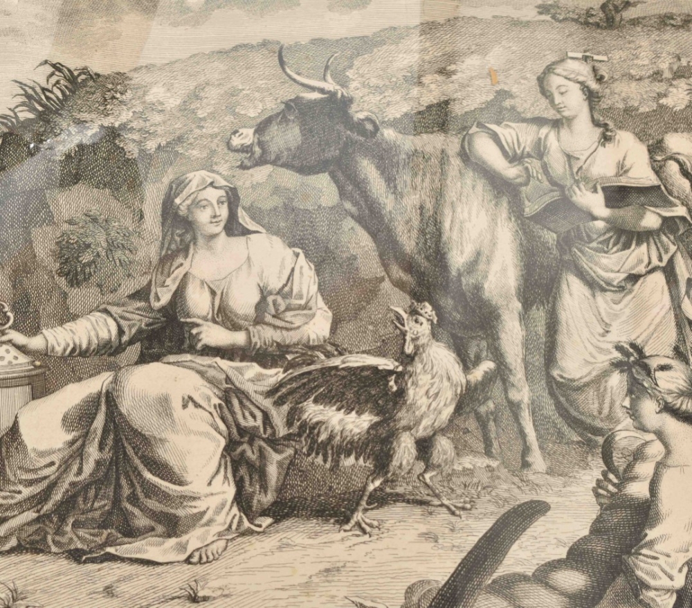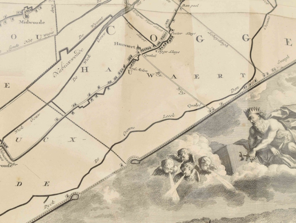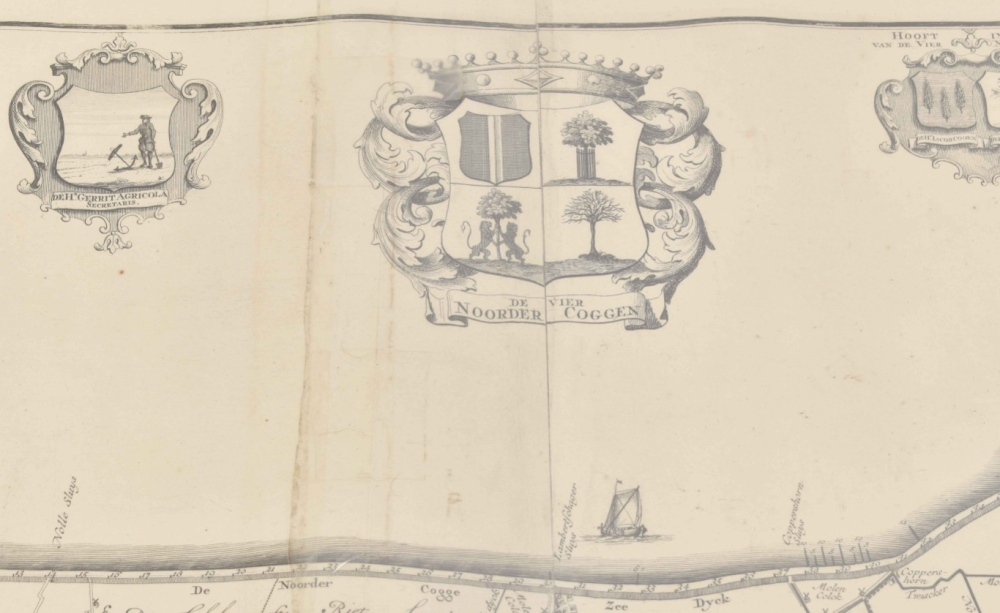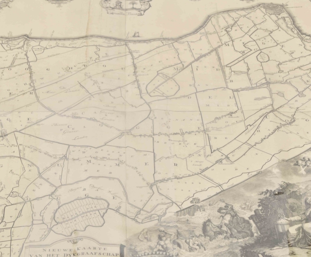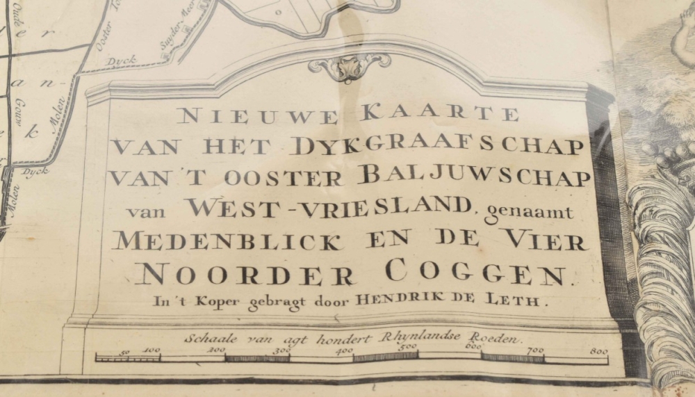 van West-Vriesland genaamt Medenblick en de Vier Noorder Koggen. Hendrik de Leth. Amsterdam, [1732]. Highly detailed composite map in 4 sheets, altogether 100 x 126 cm. Lower right monumental allegorical cartouche by Pieter Straat (signed in the plate), title bottom centre and at the top 7 coats of arms of the Dijkgraaf, the Heemraden etc.; verso occ. strengthened with paper. Scarce.