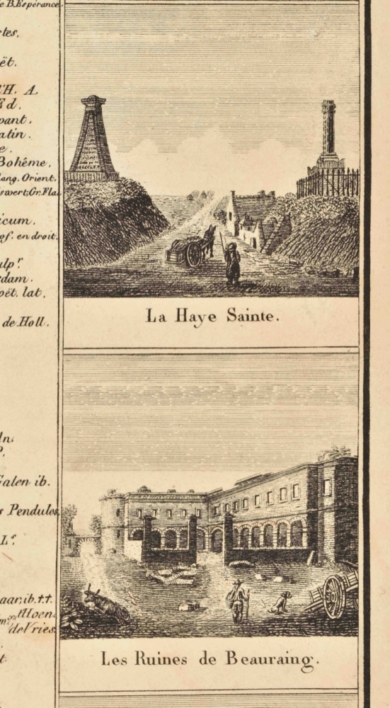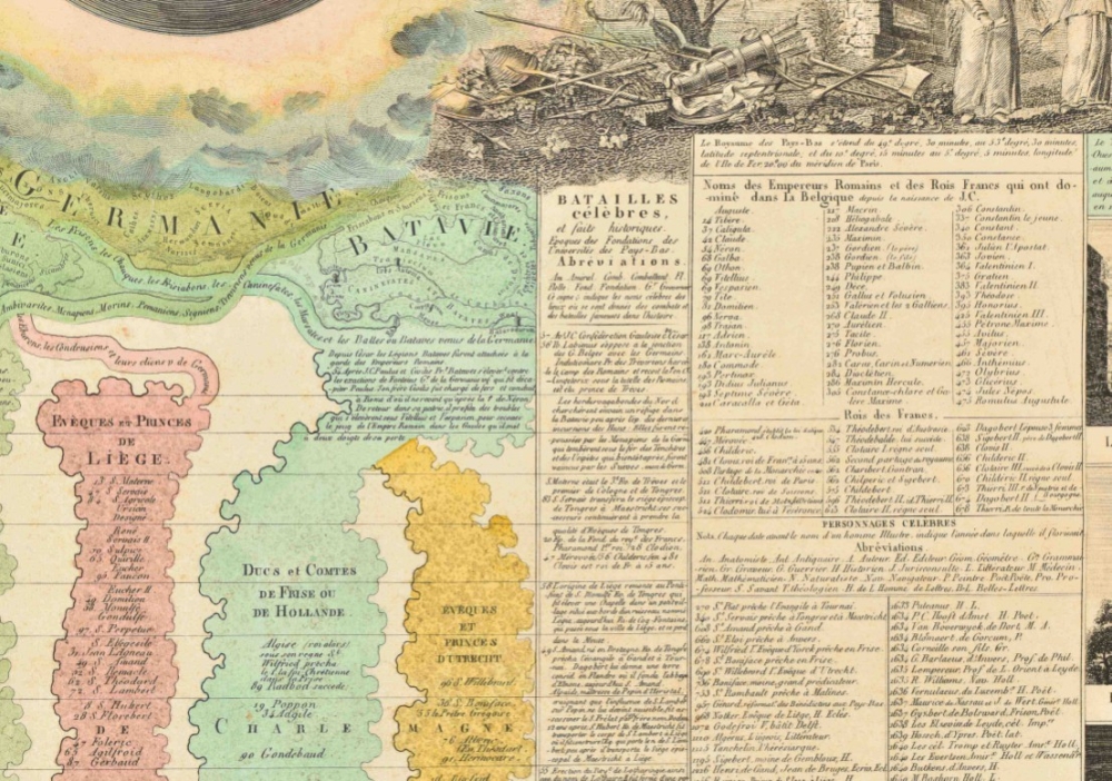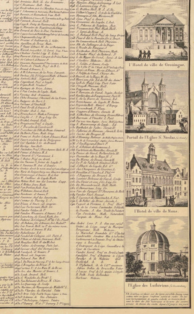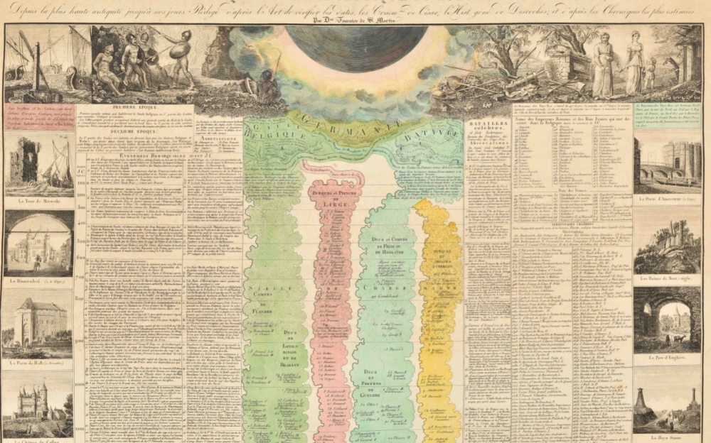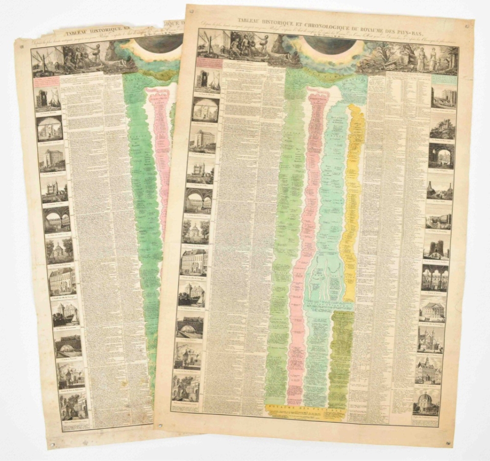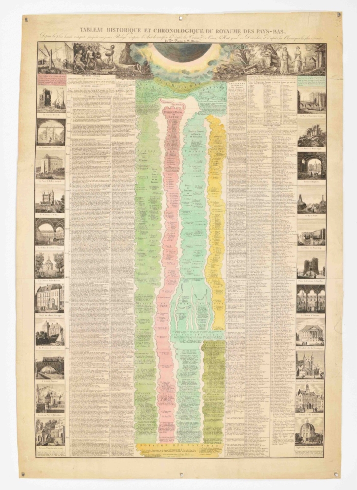 Depuis la plus haute antiquité justqu'a nos jours (...). Désiré Fournier de St. Martin. Bruxelles, [1825]. Composite engraved leaf (93 x 65 cm) with title, central timeline in colour with a list of events on both sides; various allegorical scenes below the title. On the left and right edges 22 charming views of the Binnenhof, Drakenstein, Nijmegen city hall, port of Rotterdam, bourse of Antwerp, Groningen city hall etc.