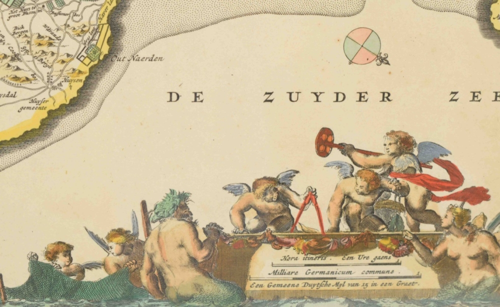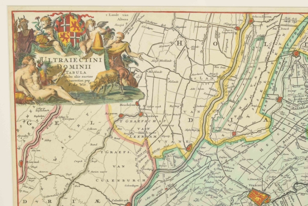 Frederick de Wit. Amsterdam, c. 1680. Map 47 x 57 cm. Original and additional colouring. Title cartouche with arms and cartouche with scales, both with putti. Framed with mount under glass. Very good copy.