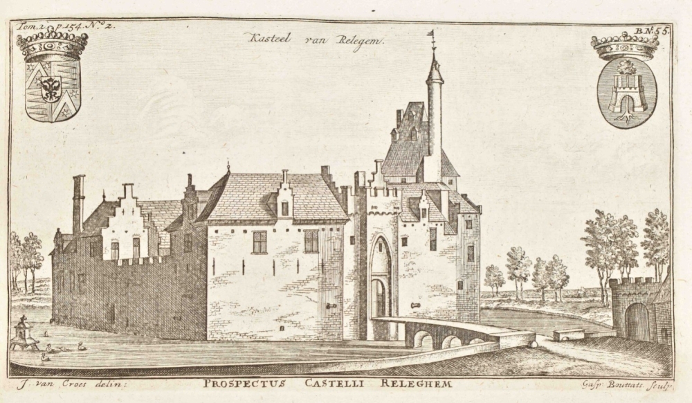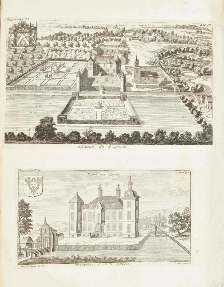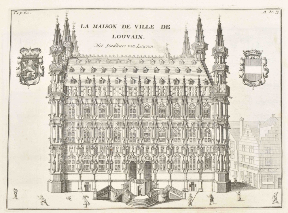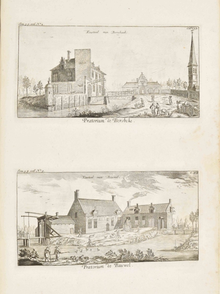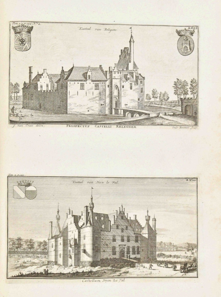 Folio, half cloth. 4 parts in one vol.: Leuven, Brussels, Antwerp and Den Bosch, 4x title in red and black with engraved vignette, 49,(1); 45,(1); 30,(1) and 27,(1) pp. with 10, 39, 37 and 9 leaves respectively with engravings of cities, villages, castles and other structures. Incomplete copy with more than 90 of 100 engraved leaves; mostly with several engravings to a leaf. Shabby copy with plain binding and (water)staining. Sold w.a.f.